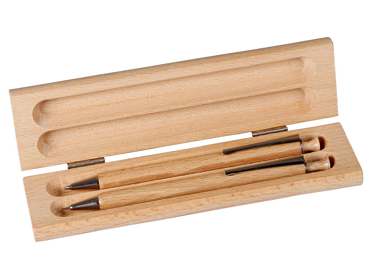 Das edle Schreibset "Buche natur" besteht aus eckigem Holzetui und zwei hochwertigen Schreibgeräten. Der Druckbleistift und der Kugelschreiber sind so immer ordentlich und stilsicher untergebracht.