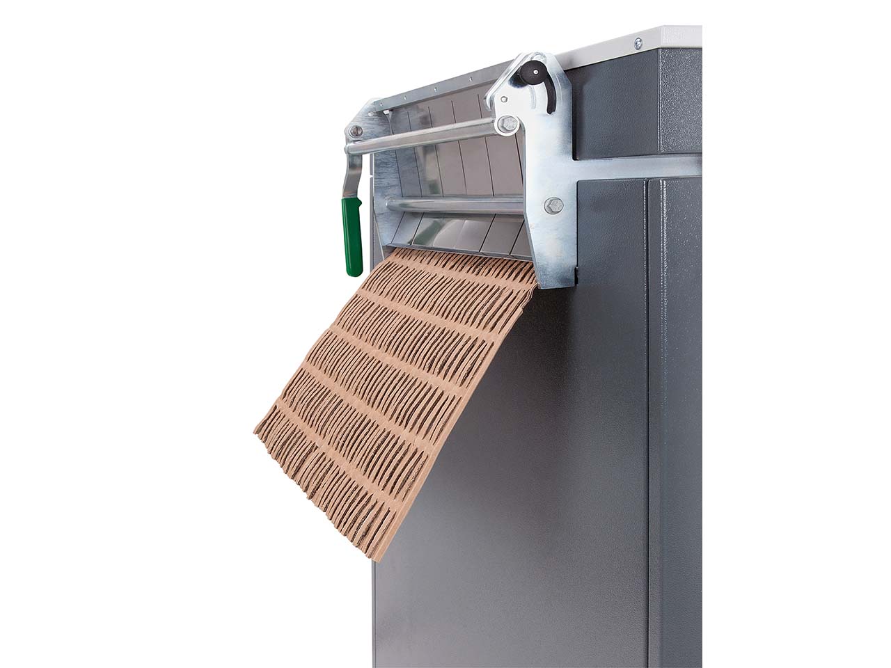 Die Verpackungspolstermaschine ist leistungsoptimiert und für den industriellen Einsatz geeignet. Die 400-V-Maschine verarbeitet mehrere Lagen Altkartonagen in einem Arbeitsgang zu Polstermatten oder Polsterfüllmaterial. Dabei erreicht sie eine Schnittgeschwindigkeit von 200 mm/s. Die Schneidwellen aus Vollstahl sind unempfindlich gegen Kartonklammern und arbeiten zuverlässig. Durch die stufenlose Einstellung der Arbeitsbreite kann das Polstermaterial exakt nach Maß gefertigt werden. Das Bedienpult mit LED-Anzeige ermöglicht eine intuitive Bedienung. Durch die stabilen Lenkrollen ist die Maschine mobil und flexibel einsetzbar. Mit dem Adapterset kann die Arbeitsumgebung staubfrei gehalten werden. B 770 x T 570 x H 1040 mm.