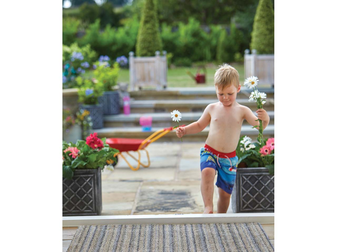 Exzellente Saugfähigkeit und nachhaltige Herstellung aus 100 % Recyclingmaterialien: Die Schmutzfangmatte von HugRug ist in jeder Hinsicht ein echter Gewinner! Sie nimmt Dreck, Staub und Feuchtigkeit effektiv auf, sodass diese nicht im Inneren des Hauses landen. Dabei kann die Fußmatte das 4-fache des Eigengewichts an Flüssigkeit aufnehmen, ohne dabei etwas an den Boden abzugeben. Dennoch fühlt sich die Matte so weich an wie ein Teppich! Damit ist sie perfekt für den Eingangsbereich in Haus und Wohnung. Die Unterseite, die aus recycelten Gummireifen besteht, ist außerordentlich rutschfest. Selbst herumrennende Kinder oder Haustiere machen der antistatischen Schmutzmatte nichts aus und sie bleibt dank der sehr rutschfesten Qualität liegen. Für die Borsten wurde Baumwolle wiederverwertet und mit 10 % Mikrofasern aus recycelten Kunststoffflaschen verarbeitet. B 100 x T 80 cm.