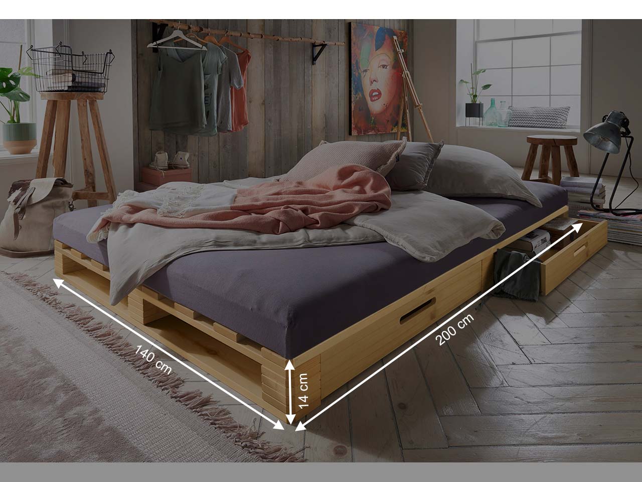 Als würde man direkt im Wald stehen: das im Massivholzbett verarbeitete Kiefernholz aus Lettland verströmt einen angenehmen Duft nach Baumharz und bringt so ein Stück Natur direkt ins Schlafzimmer! Dank seiner feuchtigkeitsregulierenden Wirkung trägt das Holz zu einem angenehmen Schlafklima bei. Gestaltet und gefertigt wurde das hochwertige Bettgestell in einer kleinen Manufaktur in Europa und bringt mit seinem modernen Paletten-Design und der gelaugten Oberfläche einen urbanen Look in die Einrichtung. Der Raum unter dem niedrigen Bettgestell wurde optimal genutzt und mit zwei Schubkästen ausgestattet. Die Liegefläche von 140 x 200 cm ist perfekt für eine Person, die sich nachts gerne ausbreitet und auch zwei Leute finden hier nebeneinander gemütlich Platz! Durch die FSC-Zertifizierung trägt dieses Bett zu einer nachhaltigen Forstwirtschaft bei und ist dank des robusten Kiefernholzes extrem langlebig.