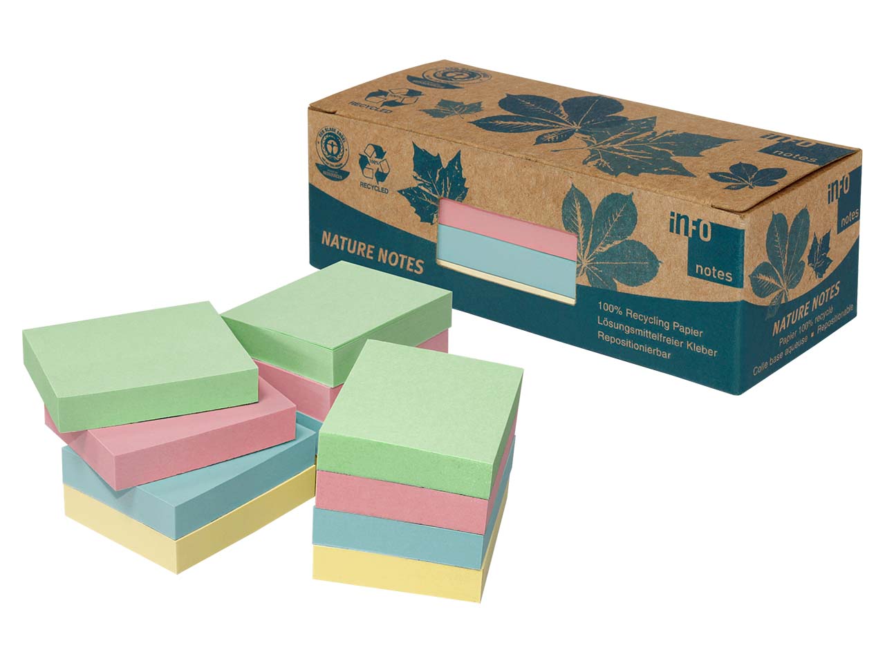 Der für die Info Haftnotizen verwendete Klebstoff wird im eigenen Labor des Unternehmens hergestellt. Der Kleber ist wasserbasiert und frei von Lösungsmitteln. Die Haftnotizen aus Recyclingpapier tragen den Blauen Engel.