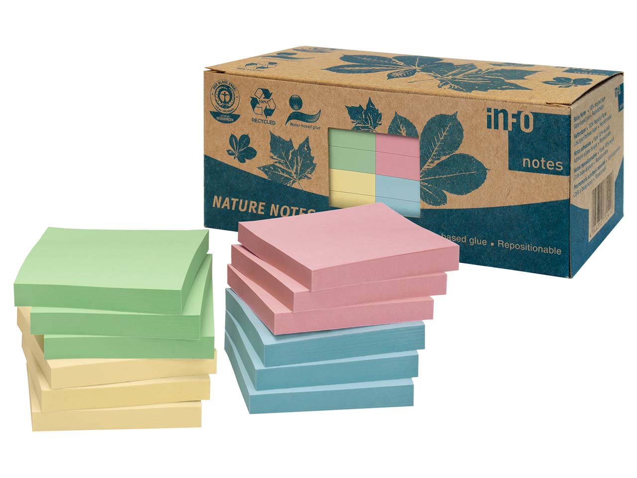 Der für die Info Haftnotizen verwendete Klebstoff wird im eigenen Labor des Unternehmens hergestellt. Der Kleber ist wasserbasiert und frei von Lösungsmitteln. Die Haftnotizen aus Recyclingpapier tragen den Blauen Engel.