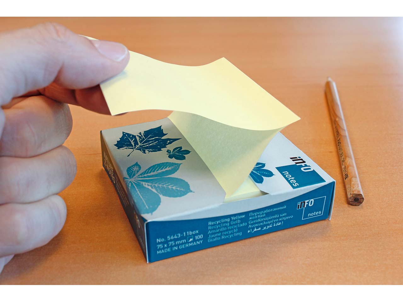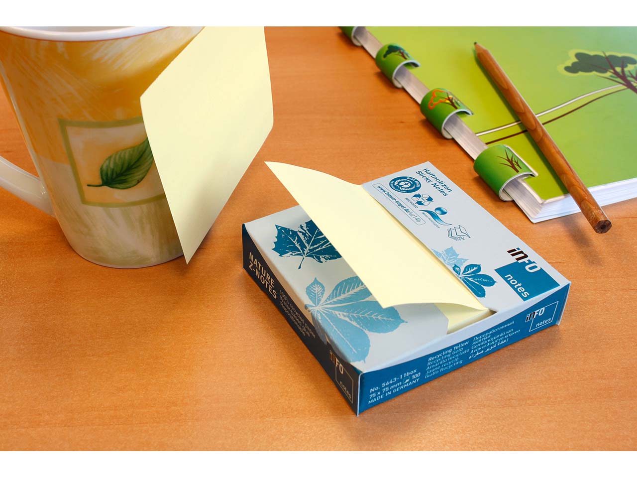 Die Haftnotizen sind aus Post-Consumer Recyclingpapier gefertigt und mit dem Blauen Engel ausgezeichnet. Die Herstellung erfolgt in Deutschland. Der Kleber auf Wasserbasis ist lösemittelfrei. Bei der Verpackung wird komplett auf Folie verzichtet.