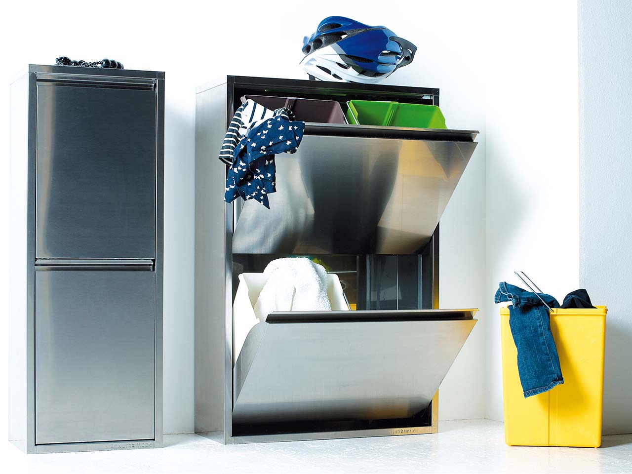 Minimalistisch designt, sodass er sich problemlos in Bad, Küche oder Flur integrieren lässt: Der Wäsche- und Abfallsammler aus Edelstahl verströmt eine subtile Eleganz und zeichnet sich durch seine hohe Qualität aus. Der Klappenmechanismus ermöglicht es, beide Klappen zusammen zu öffnen. Trennen und Sammeln von Abfall oder Wäsche gestaltet sich mit diesem kompakten Schrank ganz einfach.