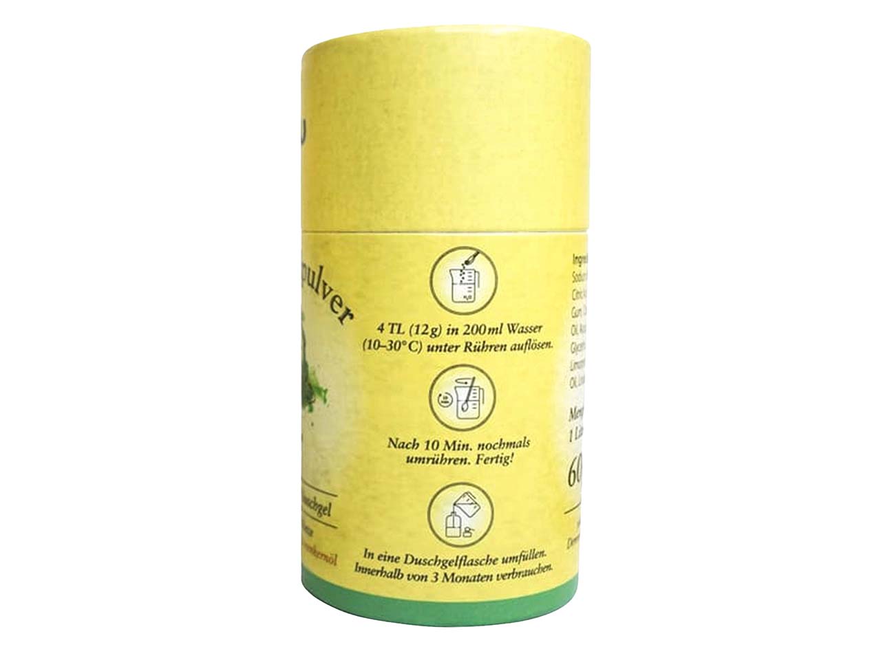 Anwendung: Einfach 4 TL (12 g) des Pulvers in ein Gefäß mit 200 ml Wasser geben und vermischen. Das angerührte Produkt wird wie herkömmliches Duschgel benutzt!