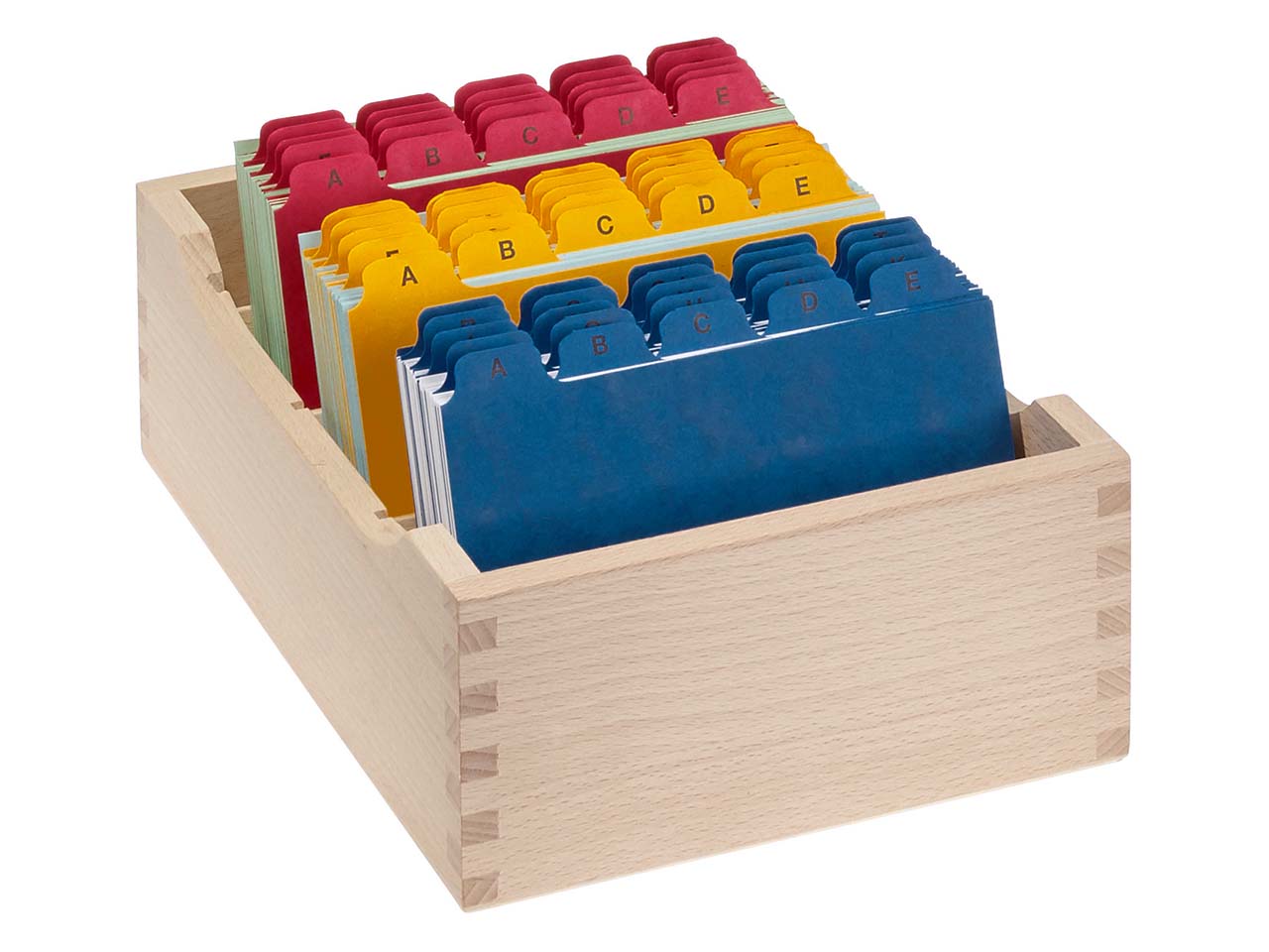 So sieht Ordnung aus: In der offenen Holzbox lassen sich Karteikarten sorgfältig sortiert aufbewahren. Die Kärtchen sind perfekt, um Vokabeln, Formeln oder Definitionen für Schule oder Studium zu lernen. Durch die Unterteilungen in der Karteikartenbox können verschiedene Thematiken getrennt voneinander untergebracht werden. Der Kasten bietet abhängig von der Grammatur Platz für rund 500 Karten (180 g/m²). Die Box besteht aus unbehandeltem, robustem Buchenholz und ist dank der verzinkten Ecken unglaublich stabil. Sie ist ideal für die Aufstellung auf dem Schreibtisch geeignet. Die Herstellung erfolgt in einer Werkstatt für Menschen mit Behinderung. Erhältlich ist der praktische Karteikasten im Format DIN A5, DIN A6 und DIN A7.