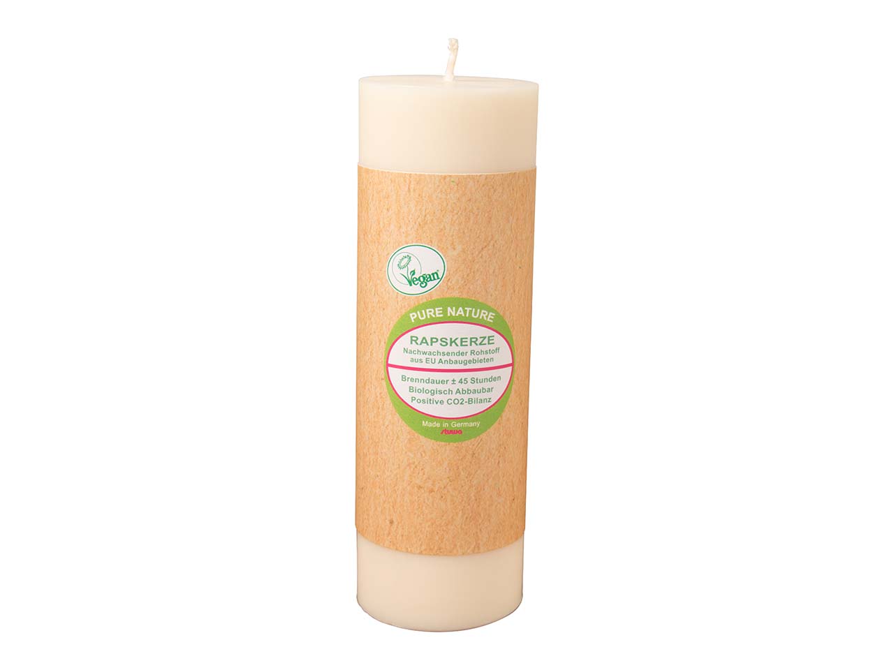 Die vegane Kerze "Pure Nature" ist nicht nur wunderschön anzusehen, sie ist aufgrund ihrer Herstellung aus Rapswachs auch eine ökologisch sinnvolle Alternative zu Produkten aus Paraffin und Stearin. Die in Handarbeit hergestellte Rapskerze punktet mit exzellenten Brenneigenschaften (Brenndauer ca. 45 Stunden). Der Baumwolldocht ist ungebleicht und verwendete Farben sind pflanzenölbasiert. Größe 50 x 150 mm.