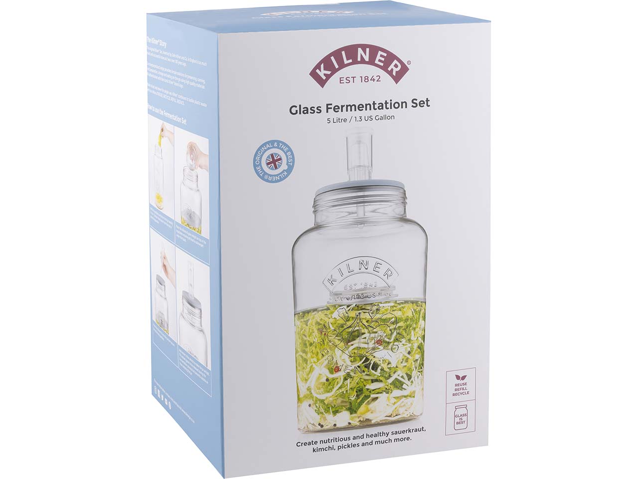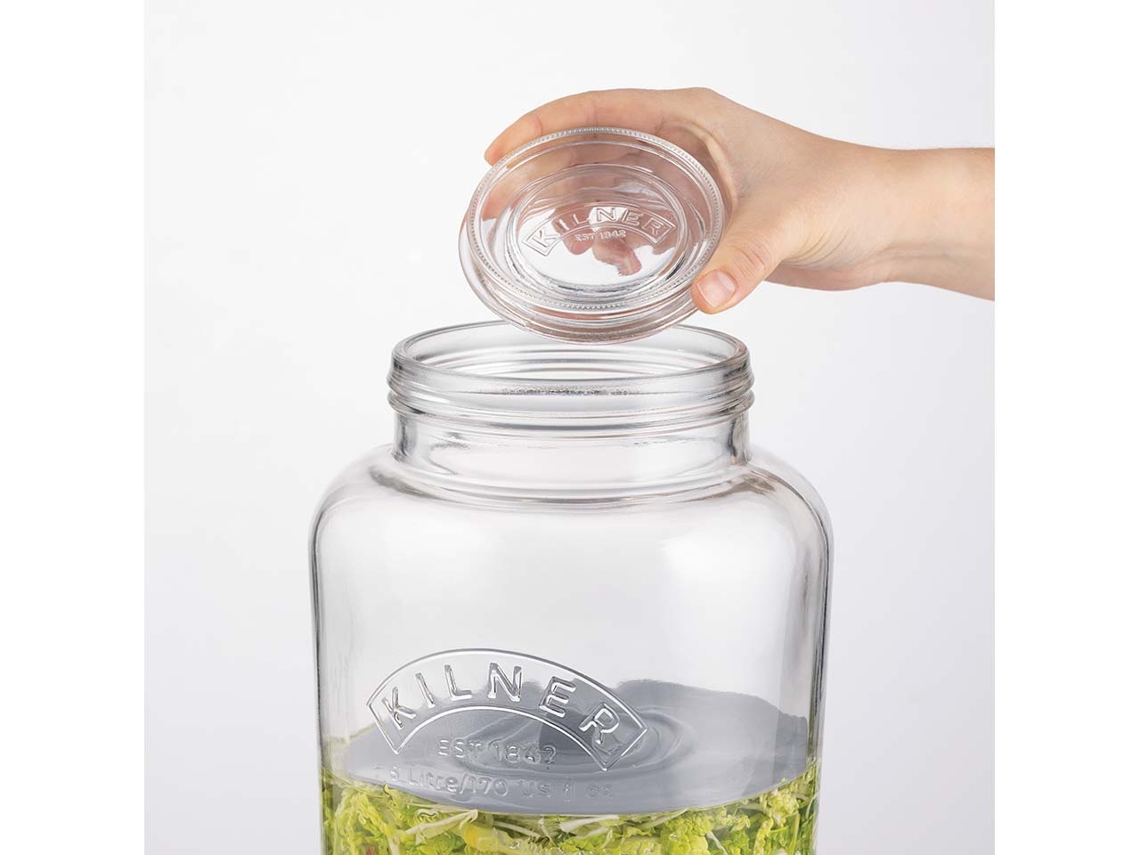 Sauerkraut, Kimchi oder Gurken – warum kaufen, wenn sich diese Köstlichkeiten zu Hause ganz einfach selber machen lassen? Genau dafür ist das große Fermentier-Set von KILNER entwickelt. Die Herstellung ist dank des Entlüftungsventils denkbar einfach. Das Einmachglas mit 5 l Fassungsvermögen erledigt die Arbeit ganz alleine. Das Fermentieren macht Gemüse besonders lange haltbar und es bewahrt – im Gegensatz zum Einkochen – Vitamine, Mineral- und Nährstoffe. Um Lebensmittel im Einmachglas zu fermentieren einfach das Ventil bis zur Hälfte mit Wasser füllen, sodass Sauerstoff während des Gärprozesses aus dem Glas entweichen kann. Durch das Fermentieren erhalten Lebensmittel einen aromatischen, leicht säuerlichen Geschmack – ein echter Genuss als Beilage oder als Snack! Im Set enthalten sind Rezepte und eine Anleitung. Ø 19,6 cm, H 19,6 cm.