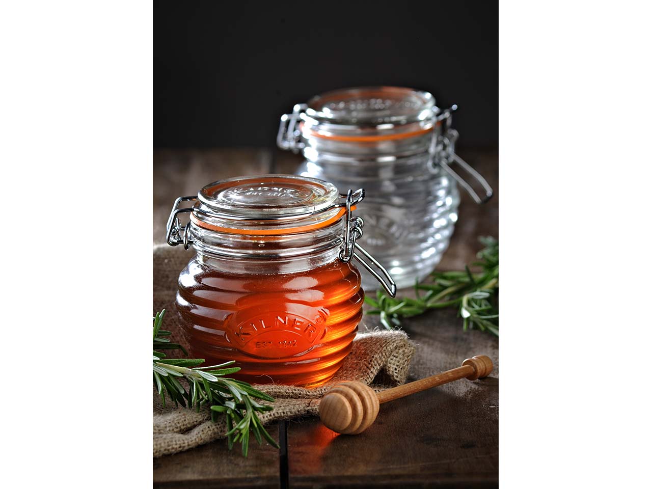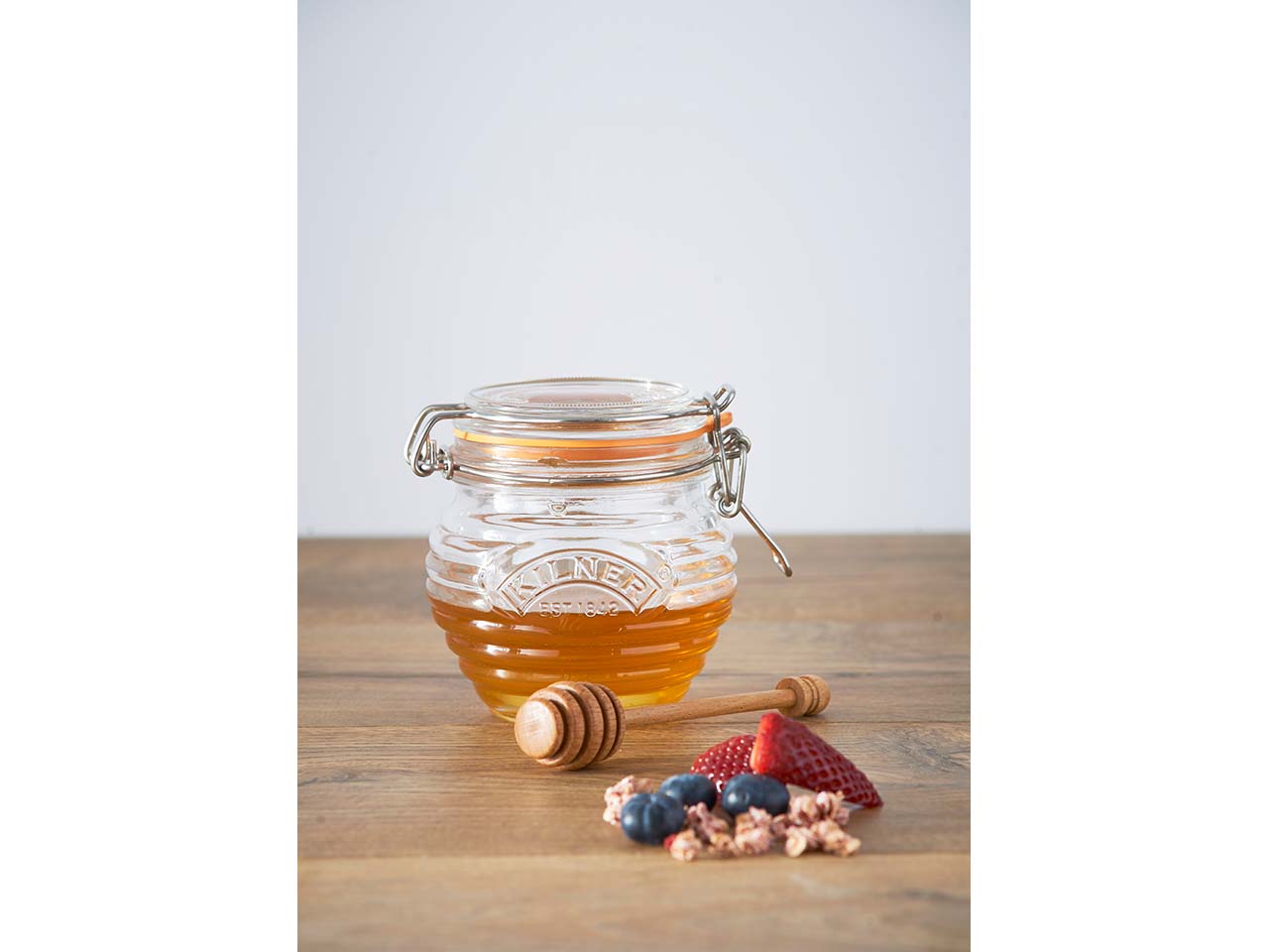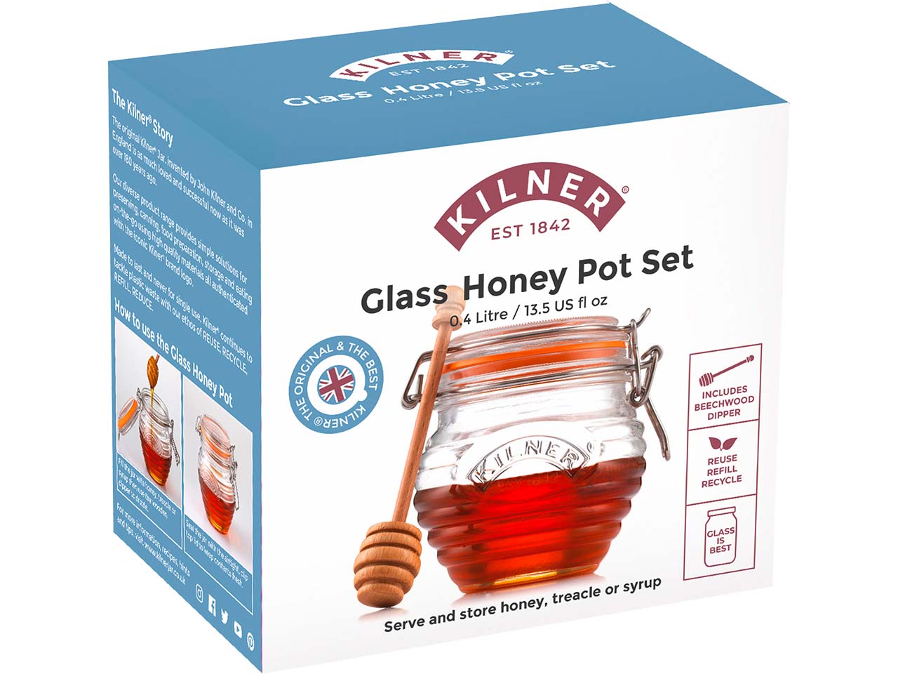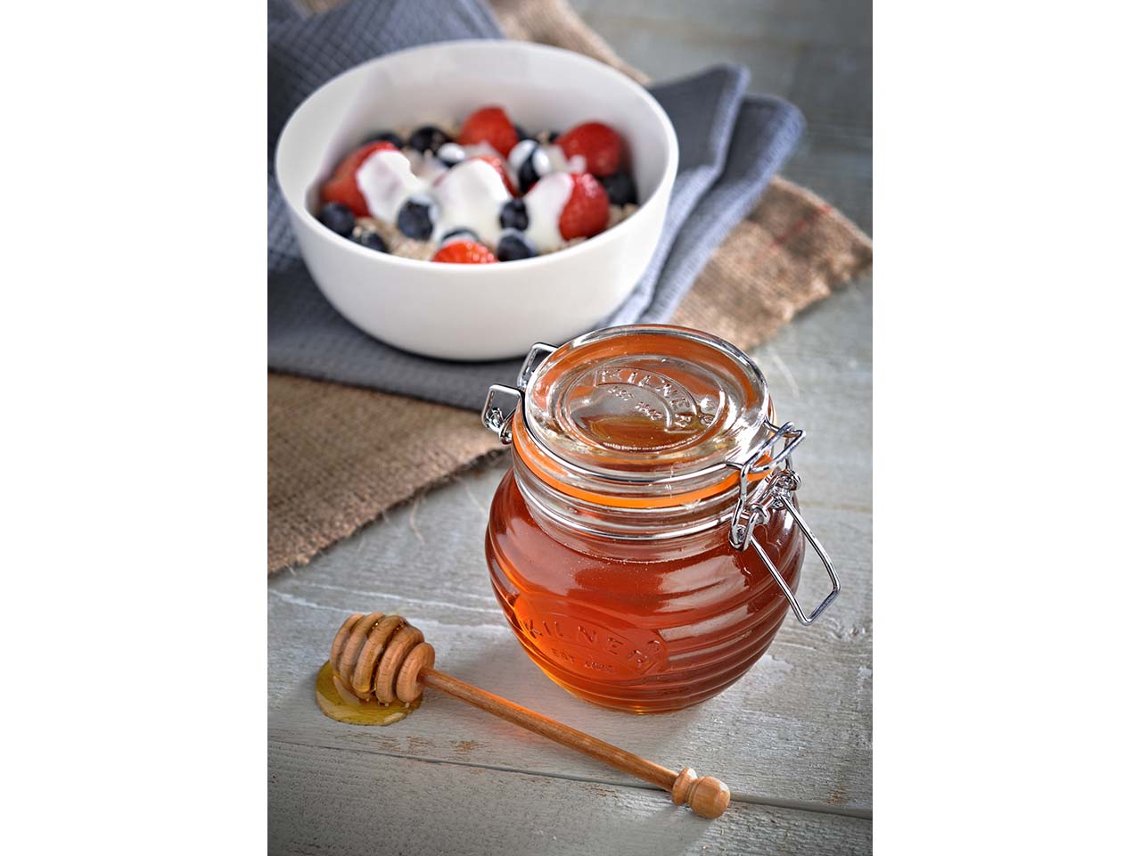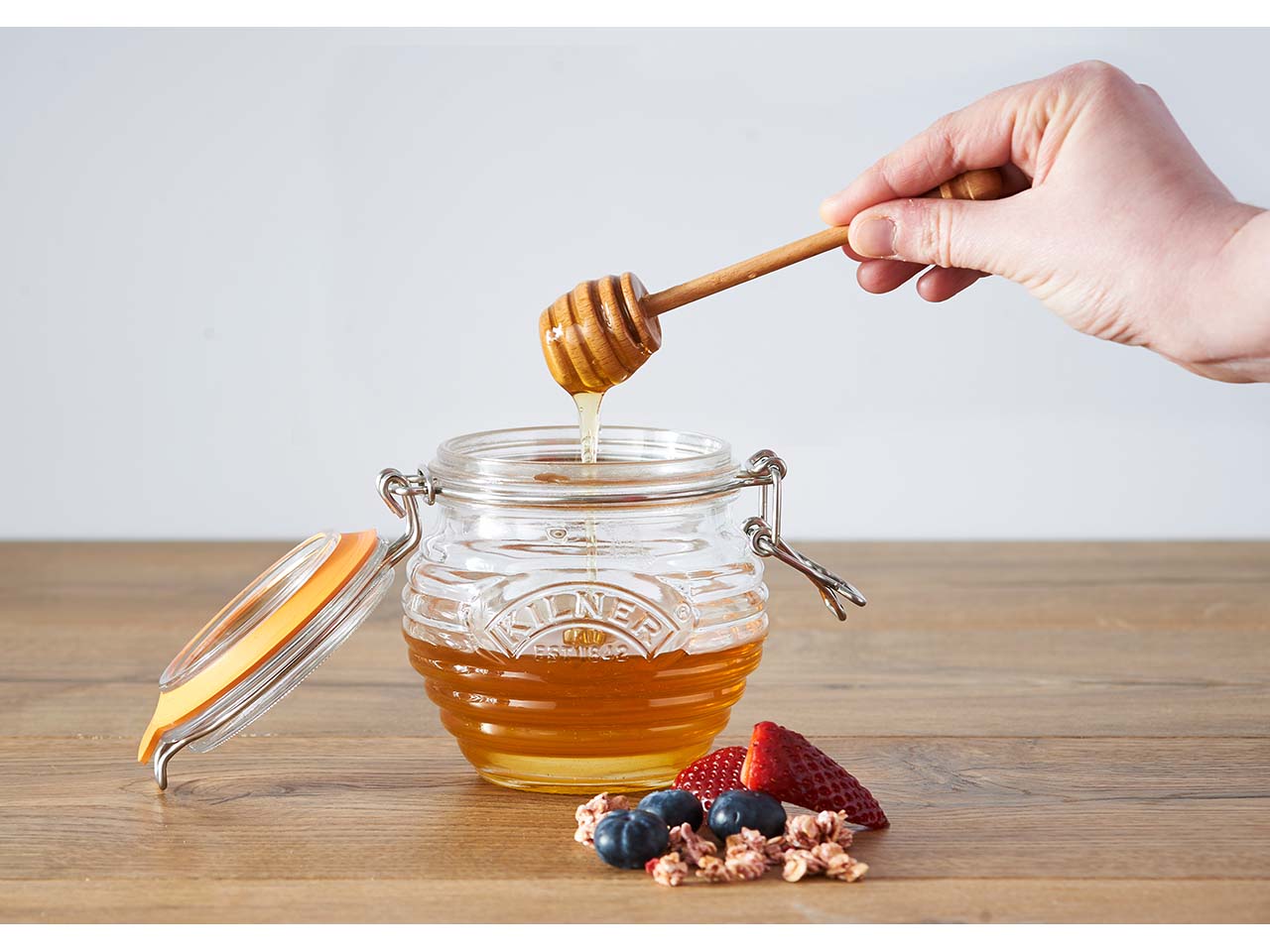Unverzichtbar für das gemütliche, sonntägliche Frühstück: Das Honigglas von KILNER punktet mit seinem traditionellen Style und exzellenter Funktionalität. Der Bügelverschluss und der Gummidichtungsring sorgen dafür, dass der Honig sicher aufbewahrt ist und seinen köstlichen Geschmack behält. Die Entnahme gestaltet sich dank des Löffels aus Buchenholz kinderleicht. Das stilvolle, runde Glas ist ein praktisches Küchenaccessoire mit Charme. Mit einem Fassungsvermögen von 0,4 l. Ø 10 cm, H 13,5 cm.