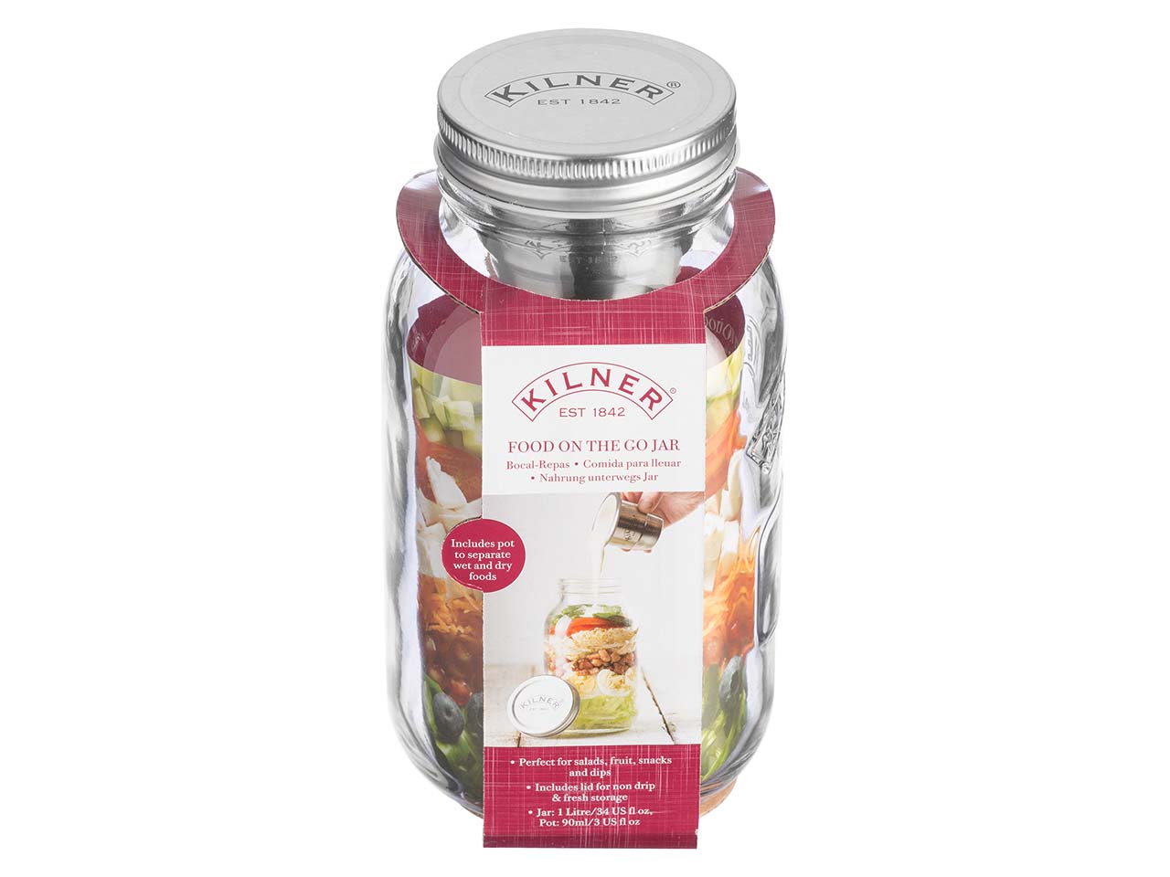 Das KILNER Vorratsglas "FOOD ON THE GO" ist ideal, um Frühstück oder Mittagessen für die Schule, Arbeit oder unterwegs zu transportieren. Die 1 l Fassungsvermögen bieten Platz für Müsli, Obst, Salat, Nudeln, Reis, etc. Der im Deckel integrierte Edelstahlbecher trennt flüssige Zutaten wie Saucen, Dressing oder Milch beim Transport von den restlichen Zutaten. Der Inhalt des Bechers wird erst kurz vor dem Verzehr mit den restlichen Zutaten vermischt. So erhalten Sie stets eine leckere, frisch zubereitete Mahlzeit.