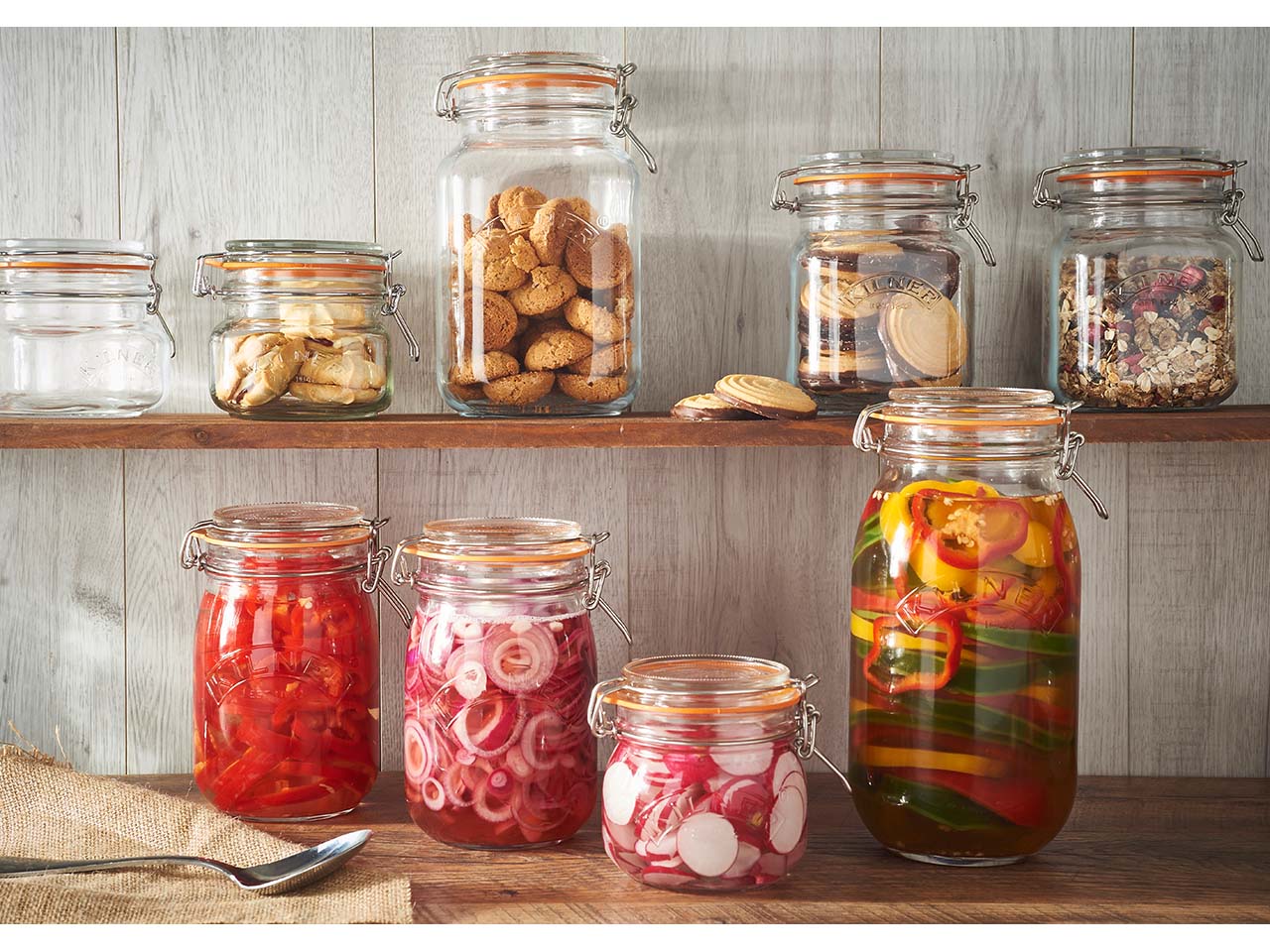 Das originale, quadratische KILNER Vorratsglas mit Bügelverschluss ist ideal, um Marmelade, Püree, Pestos, selbstgemachte Brotaufstriche und mehr einzumachen und zu konservieren. Trockene Lebensmittel wie Mehl, Kaffee und Reis lassen sich ebenfalls lagern und aufbewahren. Die hochwertigen Edelstahlclips sorgen dafür, dass das Vorratsglas luftdicht schließt. Das spülmaschinengeeignete Vorratsglas hat ein Fassungsvermögen von 1 l.