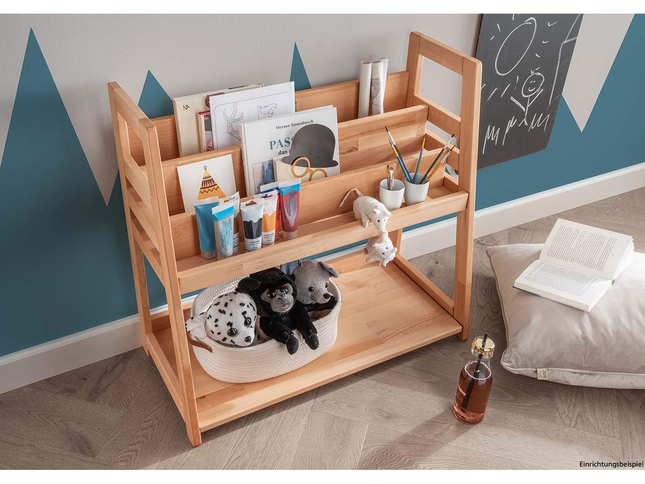 Dieses klar strukturierte, offene Kinderregal nach dem Montessori-Prinzip gibt Kindern die Möglichkeit, ihr Zimmer selbst einzurichten und spielerisch Selbstständigkeit zu lernen. Die Höhe ist so gewählt, dass Kinder problemlos überall herankommen. Im unteren Fach ist z.B. Platz für Kuscheltiere oder größere Spielzeuge. Die obere, dreigeteilte Bücherablage ist ideal, um Bücher und Hefte ordentlich aufzubewahren und zu präsentieren. Wenn die Kinder älter werden, ist das Montessori-Regal auch ideal neben dem Schreibtisch, um Schulhefte und Schulbücher griffbereit zu haben. Hergestellt ist das Regal aus massivem Holz. Zur Auswahl stehen Wildeiche, Buche und Buche weiß. B 83 x T 38 x H 75 cm.