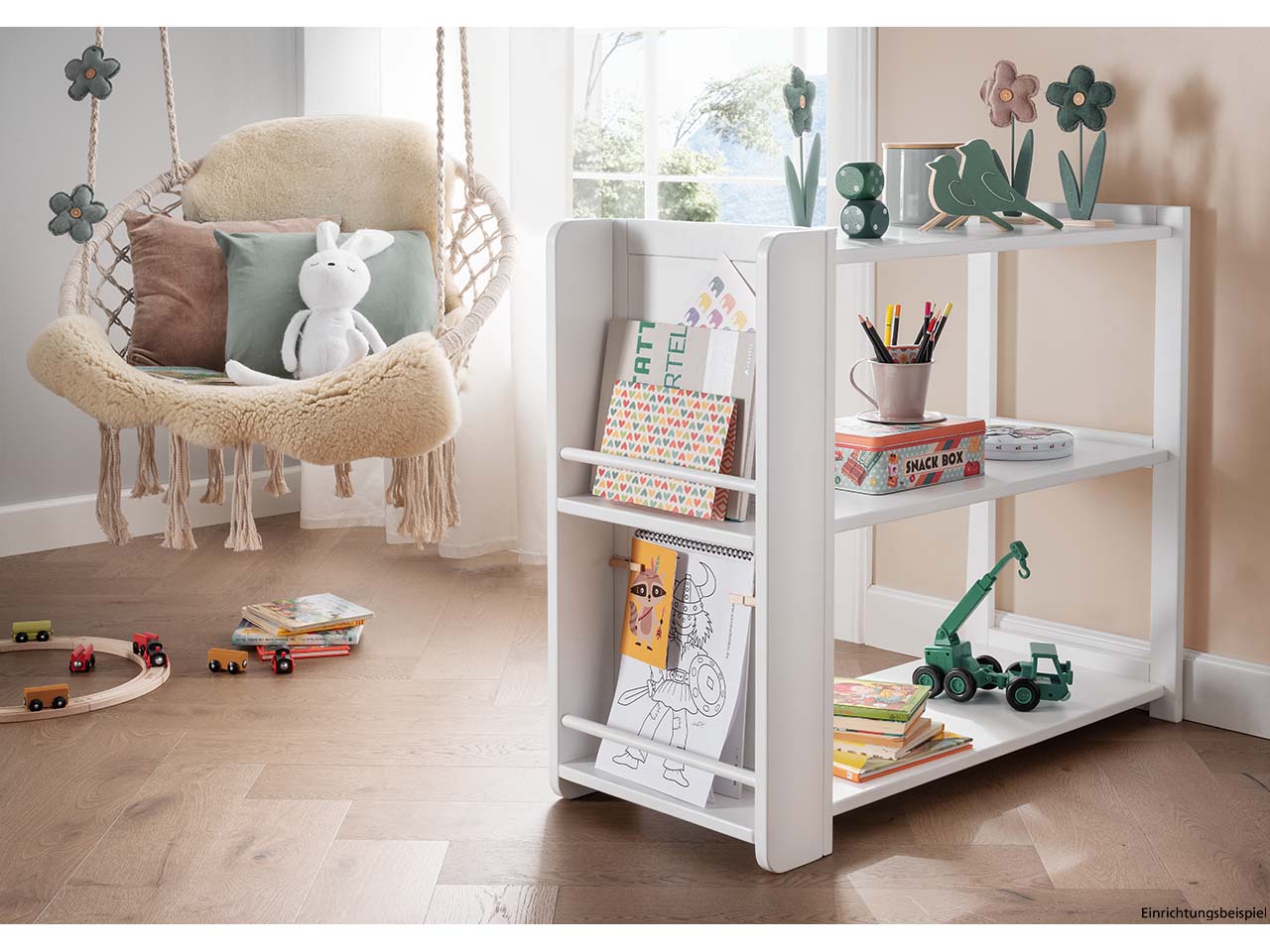 Dieses offene Regal ist nach dem Montessori-Prinzip entwickelt: Die Selbstständigkeit und Kreativität von Kindern wird ganz spielerisch gefördert. Die niedrige Höhe der drei Fachböden ermöglicht es, dass Kinder das Regal selbstständig einräumen. Sie entscheiden selbst, wo Spielzeug, Lernmaterialien und mehr stehen. Das stärkt auch ihren Ordnungssinn. Seitlich ist ein Bücherregal integriert, sodass Kinder ihre Lieblingsbücher wie in einer eigenen kleinen Bibliothek präsentieren können. Das Montessori-Kinderregal ist perfekt, um Kindern die Möglichkeit zu geben, ihre Umgebung aktiv mitzugestalten. Durch die Herstellung aus massivem Holz hat das Regal eine besonders robuste, langlebige Qualität. Zur Auswahl stehen Buche, Wildeiche oder Buche weiß. B 90 x T 38 x H 75 cm.