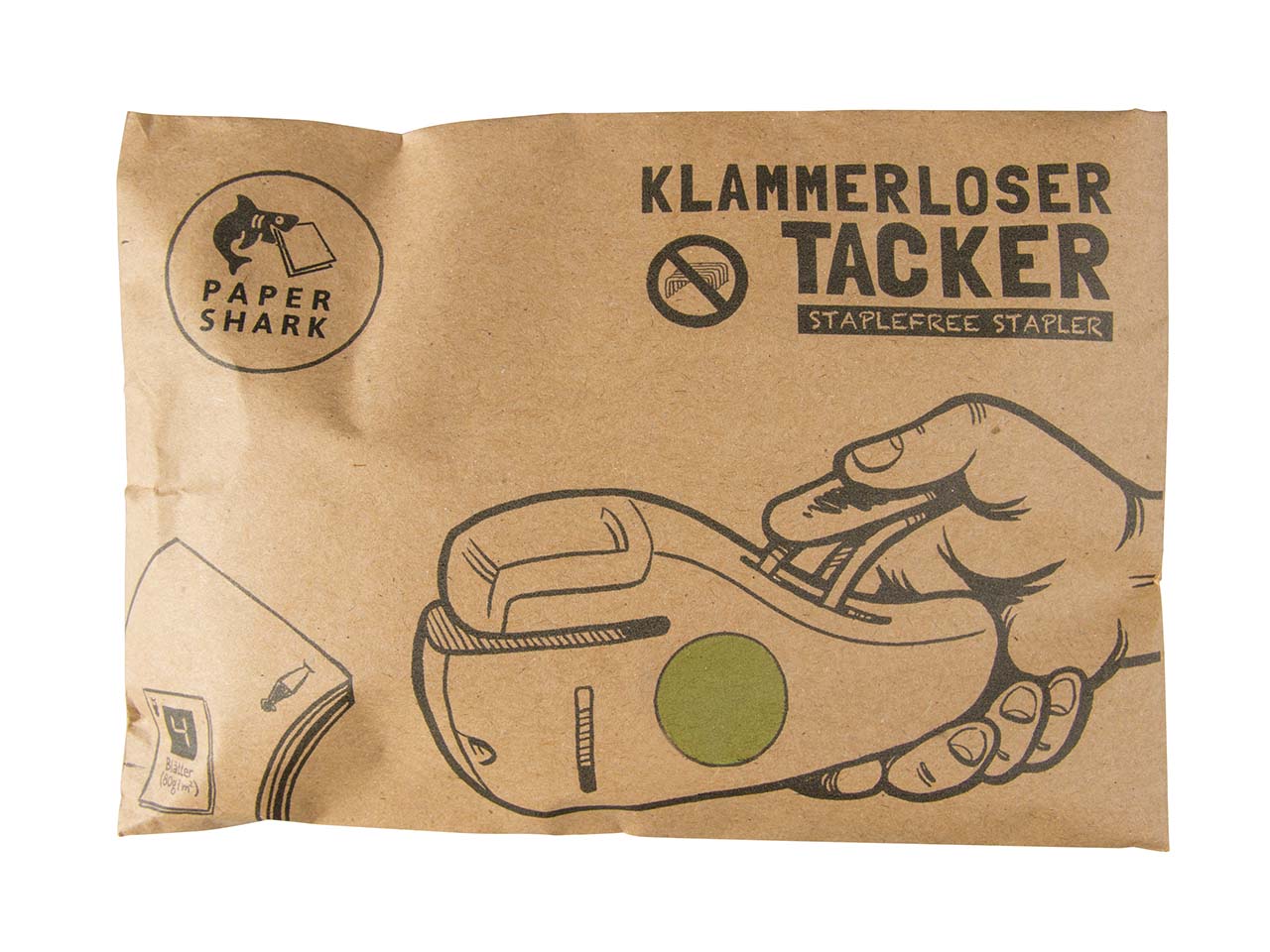 Der "Paper Shark" ist ein klammerloser Tacker mit patentierter Technik für Schule, Büro, Haushalt und zum Verschließen von Papiertüten. Der Handtacker für bis zu 4 Blatt (80 g) heftet ohne Klammernadeln, was die Umwelt schont und im Ordner Platz und Ressourcen spart. Fingernägel und Aktenvernichter werden geschont. Das Sichtfenster ermöglicht ein zielgenaues Heften. Zum Entheften Blatt wenden und den gleichen Vorgang über das gleiche Loch durchführen.