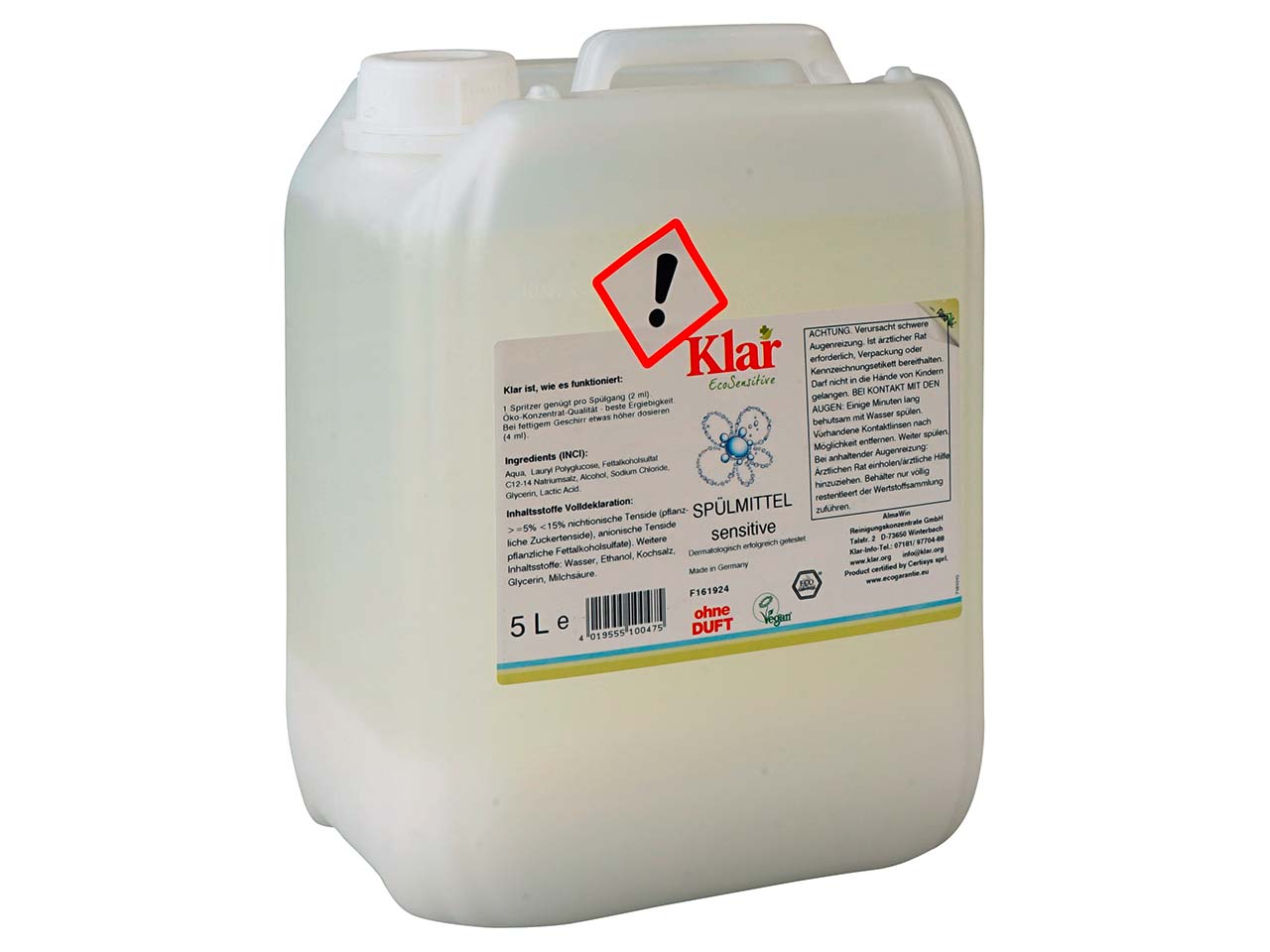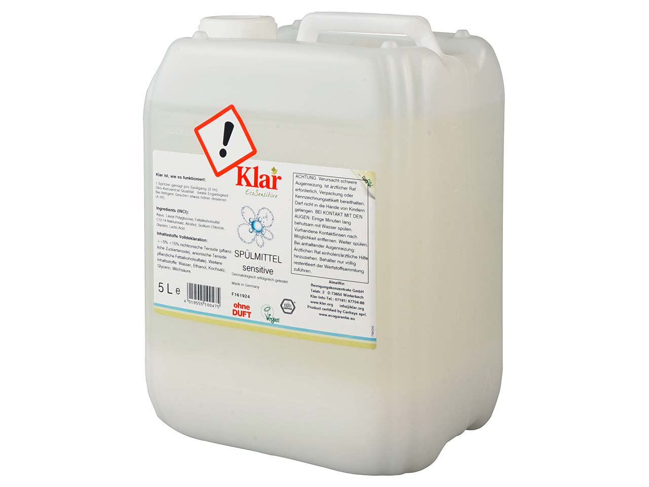 Eine milde und gleichzeitig wirksame Formel: Das umweltverträgliche Geschirrspülmittel von Klar beseitigt effektiv Fett, Kalk und Schmutz von Besteck, Geschirr und Gläsern. Auch Töpfe und Pfannen werden mühelos wieder strahlend sauber, während das duftstofffreie Spülmittel dabei besonders sanft zur Haut ist. Durch die hohe Konzentration der natürlichen und biologisch abbaubaren Inhaltsstoffe ist das vegane Mittel besonders ergiebig und schon ein kleiner Spritzer (2 ml) genügt, um das Geschirr zu reinigen. So wird die Wasserbelastung möglichst gering gehalten und die Umwelt geschont. Inhalt 5 l.