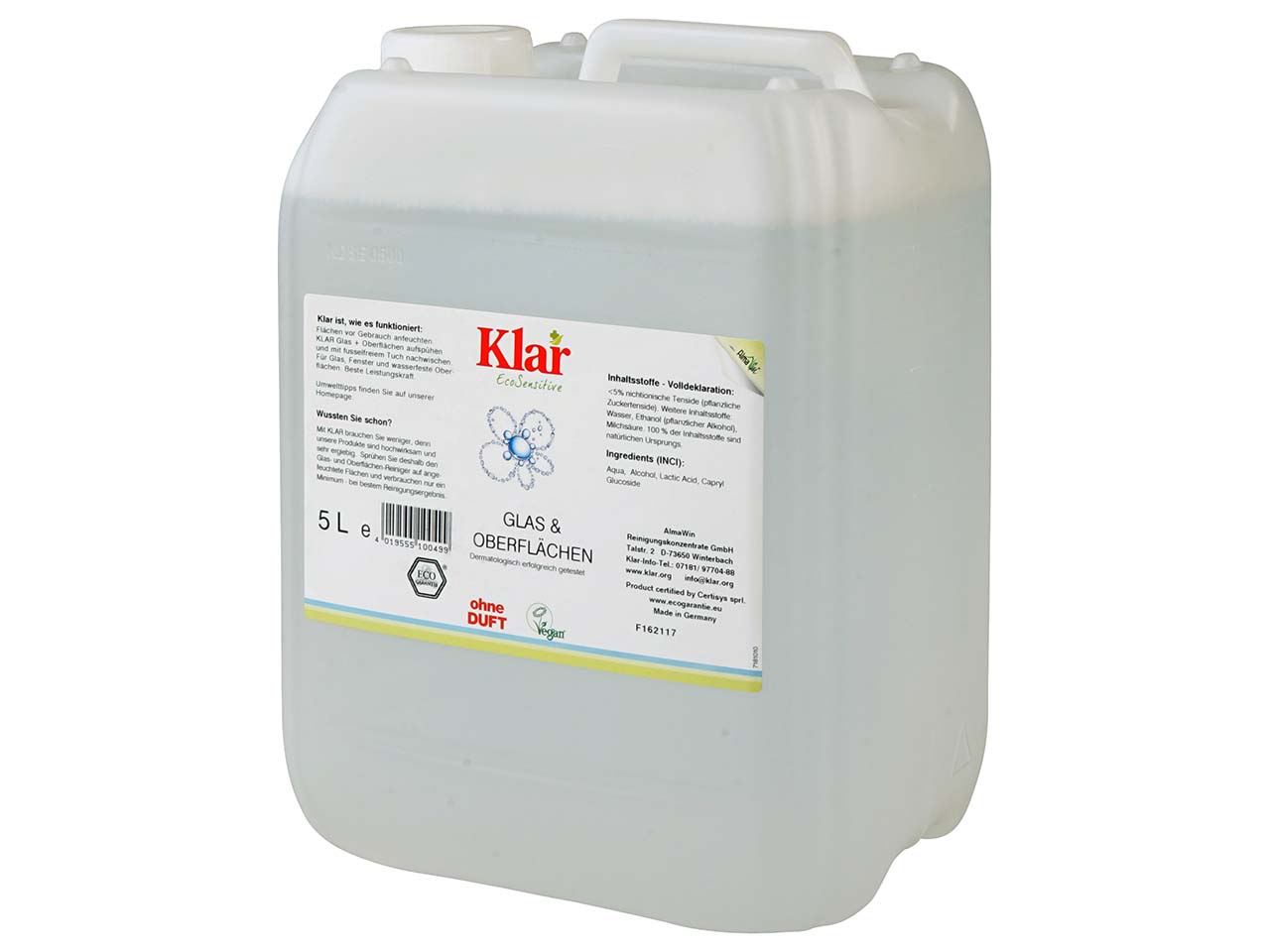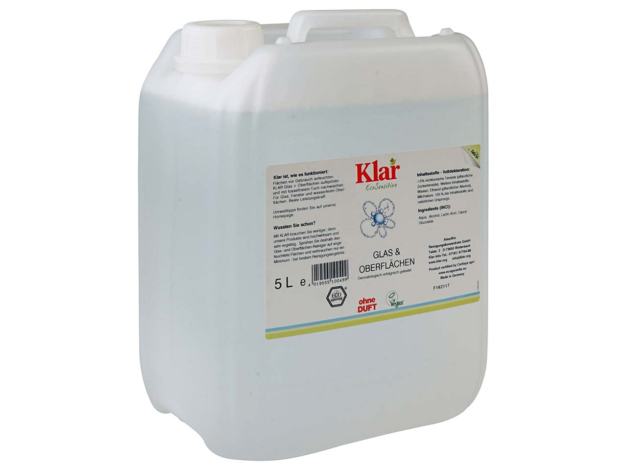 Produkte von Klar werden möglichst verträglich für Mensch und Umwelt hergestellt und so besteht auch der Glas- und Oberflächenreiniger aus rein pflanzlichen und mineralischen Inhaltsstoffen, die zu einer milden und gleichzeitig wirkungsvollen Formel zusammengesetzt werden. Dabei kommen weder Chlor, Phosphate noch Gentechnik zum Einsatz und die natürlichen Zutaten sind besonders schnell biologisch abbaubar. Der 5 l Kanister hält besonders lange und so muss das Konzentrat nicht ständig nachgekauft werden.