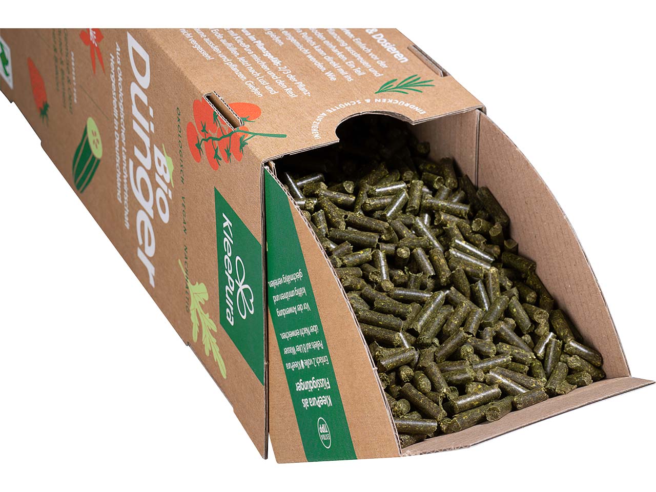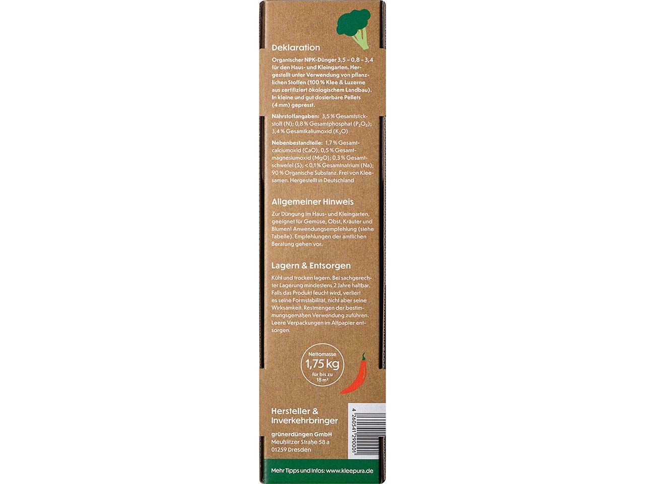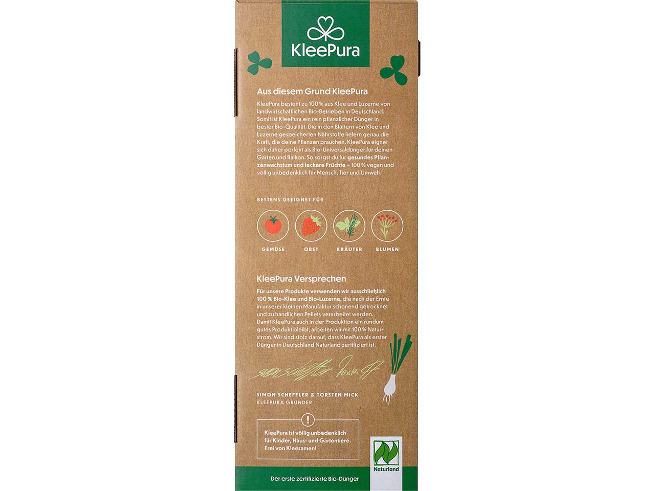 Der in Deutschland hergestellte KleePura Bio-Dünger ist weltweit der erste mit Naturland-Zertifizierung. Der Dünger aus Bio-Klee ist für alle Pflanzenarten, Obst, Gemüse, Kräuter und Blumen geeignet. In seiner Wirkung ist der Bio-Dünger aufgrund seiner Nährstoffzusammensetzung einzigartig. Er ist frei von Schlachtabfällen und Reststoffen der konventionellen Lebensmittelindustrie. Der Bio-Dünger ist zu 100 % vegan und unbedenklich für Mensch, Umwelt und Tier. Inhalt 1,75 kg.
