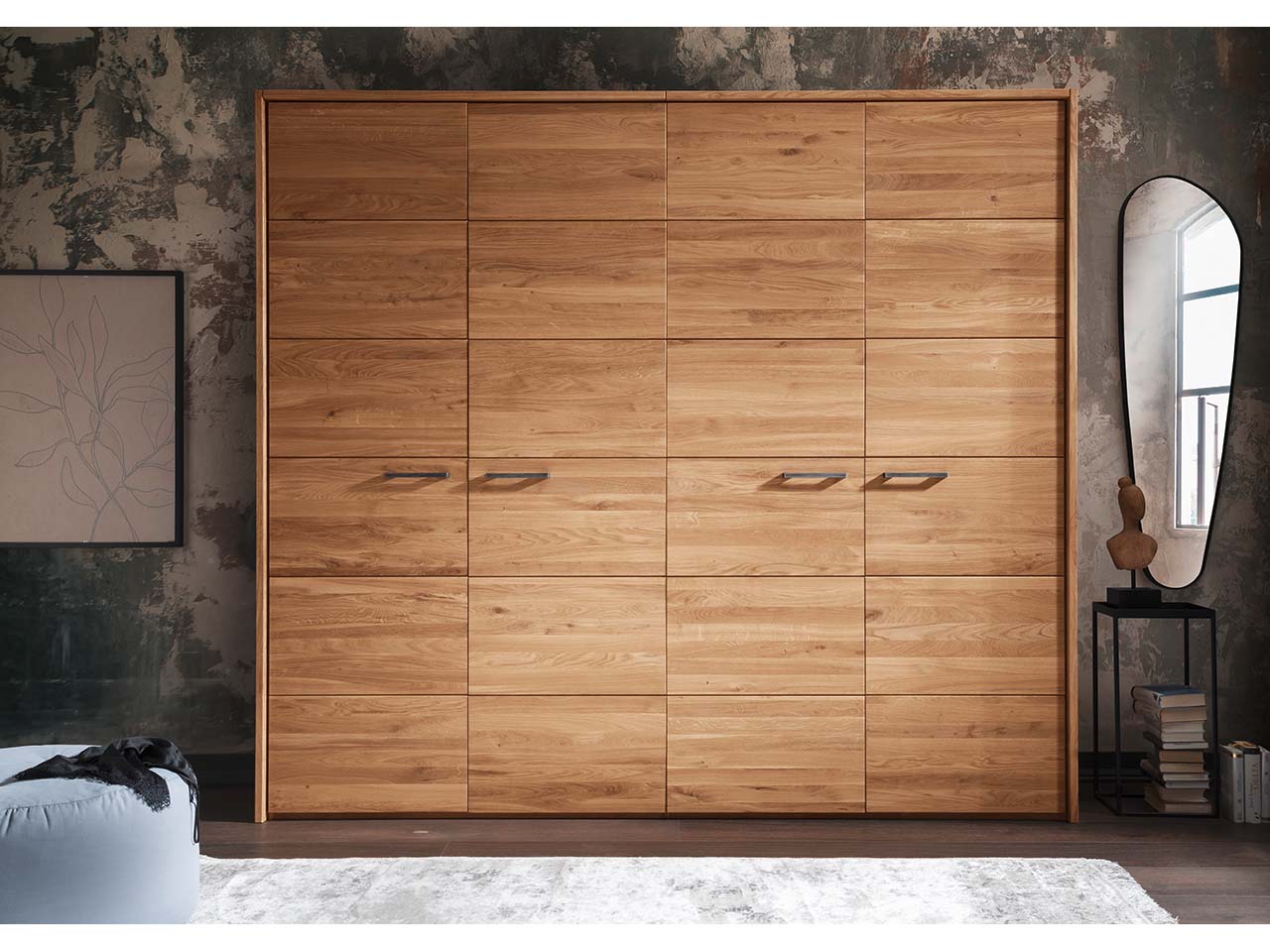 Dieser wunderschöne Kleiderschrank bringt Natürlichkeit in Schlaf- und Ankleidezimmer. Die massive Wildeiche ist mit ihrer lebendigen Maserung immer einzigartig. Der Passepartoutrahmen rahmt die Massivholzfront harmonisch ein und setzt sie perfekt in Szene. Die Bügelgriffe an den Türen brechen die natürliche Optik auf und bringen moderne Elemente ein. Das Beste: Der Kleiderschrank ist 2-, 3-, 4-, oder 5-türig erhältlich. So ist für jeden Bedarf und jedes Platzangebot die passende Größe dabei.
