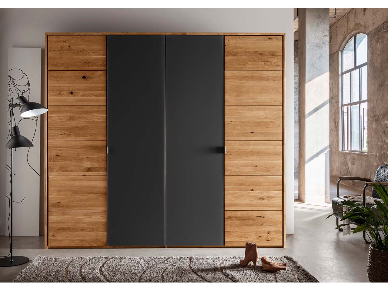 Dieser Kleiderschrank kombiniert natürliche Elemente mit zeitloser Modernität. Dadurch entsteht ein praktischer Alltagsgegenstand, der so schön ist wie ein Designobjekt. Das Passepartout rahmt die lebendig gemaserte Holzfront aus massiver Wildeiche ein, deren Optik durch das mittige Anthrazitglas aufgebrochen wird. Im Inneren ist viel Platz für das ordentliche Verstauen von Bekleidung. Damit der Ankleideschrank in jedes Schlafzimmer passt, ist er 3-, 4- oder 5-türig erhältlich. Die Winkelgriffe ermöglichen ein einfaches Öffnen.