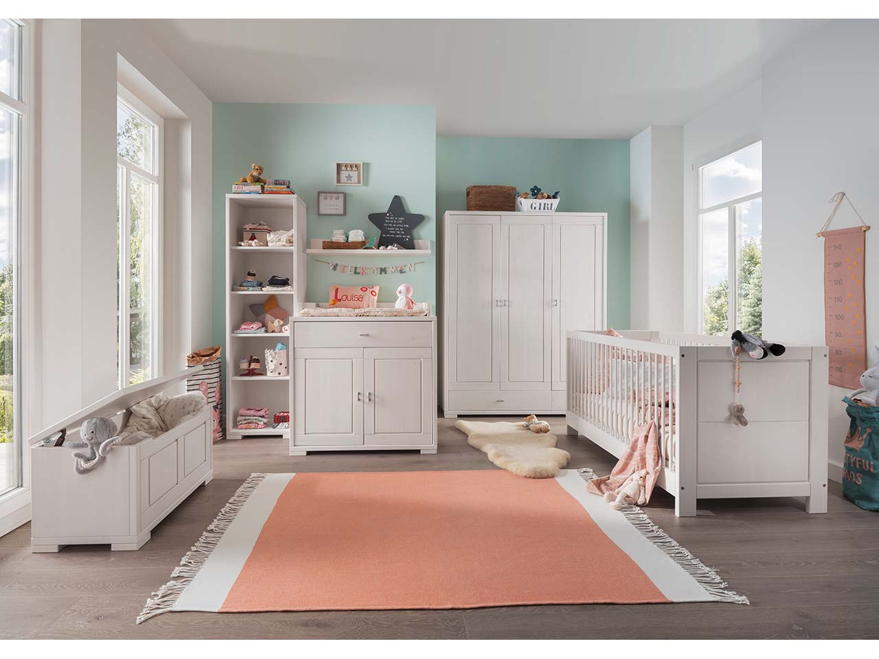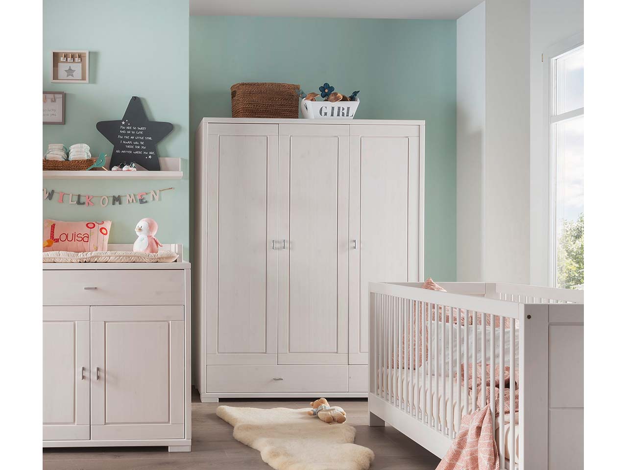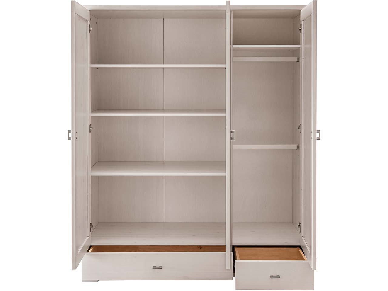 Solide Verarbeitung, ansprechende Optik und hervorragende Langlebigkeit zeichnen diesen 3-türigen Kleiderschrank aus. Die Herstellung aus FSC-zertifizierter, massiver Kiefer verleiht dem Möbelstück eine besonders robuste Qualität. Die clevere Aufteilung mit vier Einlegeböden und 2 Kleiderstangen im Inneren ermöglicht eine übersichtliche Aufbewahrung von Kleidung, Handtüchern, Bettwäsche und vielem mehr. Zwei Schubladen bieten zusätzlich Stauraum. Der Schrank ist in Weiß, Weiß/Provence oder gebeizt und geölt erhältlich. B 147 x T 52 x H 178 cm.