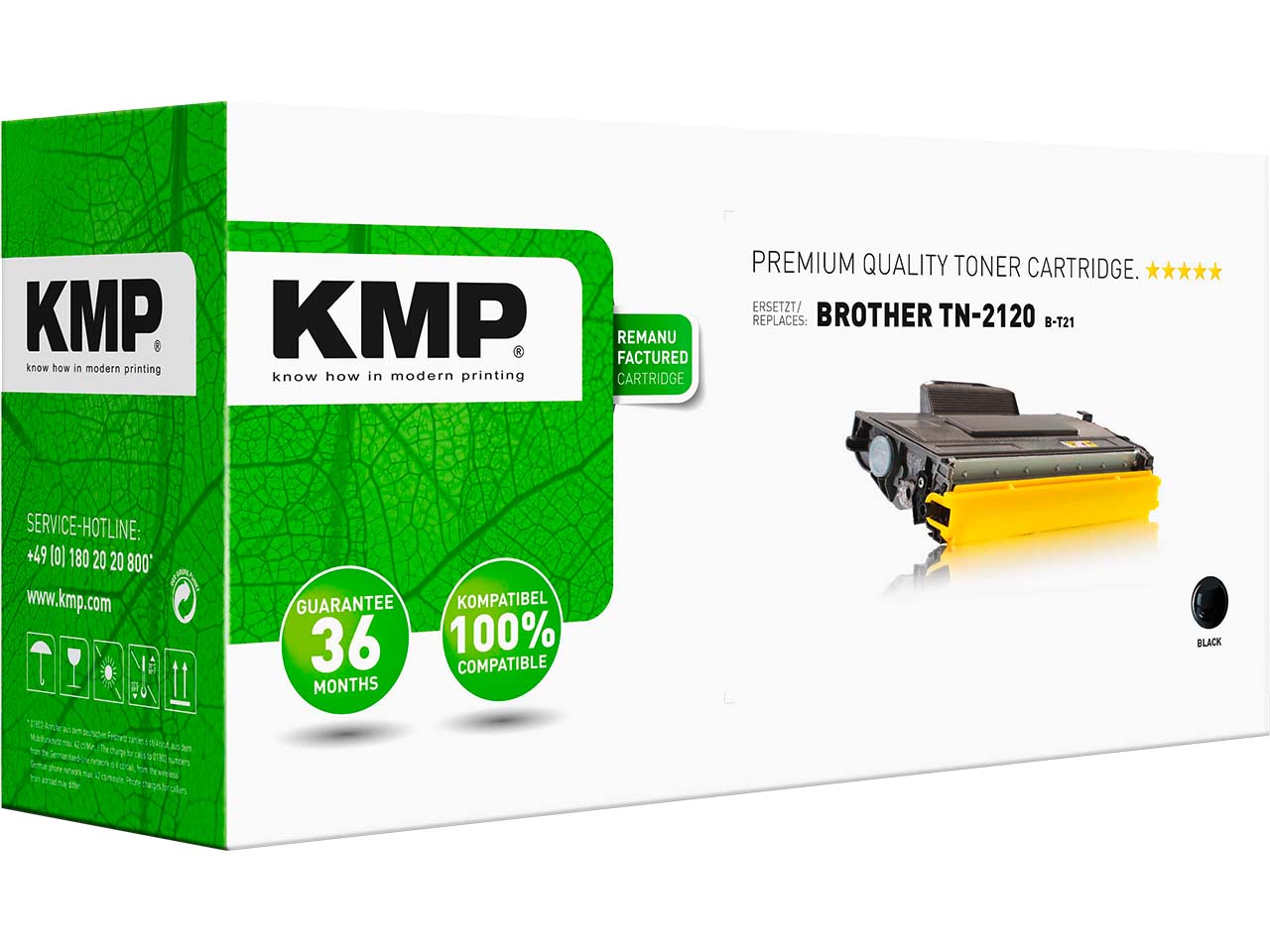 Der KMP Toner überzeugt mit hochwertiger Qualität und stellt einen vollwertigen, kostengünstigen Ersatz für den Original Brother Toner TN-2120 dar. Er sorgt für gestochen scharfe Dokumente, Grafiken, etc. Die Tonerkartusche ist passend für verschiedene Druckermodelle und reicht bei 5 % Schwärzung für den Druck von bis zu 2.600 Seiten. Farbe schwarz.