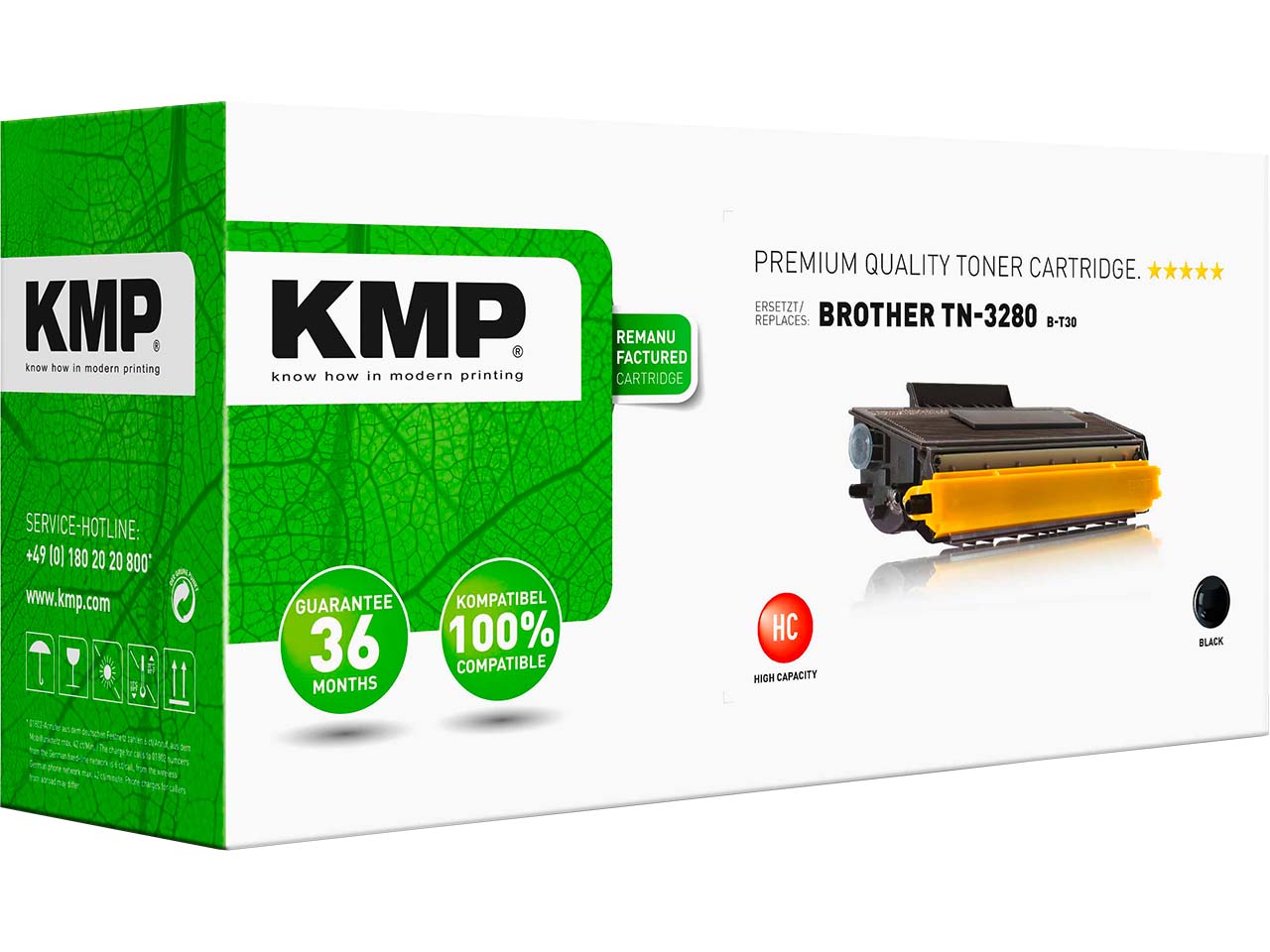 Die KMP Tonerkartusche ist eine zuverlässige und preiswerte Option zum Original-Toner TN-3280 und überzeugt mit ausgezeichneter Druckqualität. Sie passt zu mehreren Brother Druckermodellen und sorgt für gestochen scharfe Ausdrucke. Mit einer Ergiebigkeit von bis zu 8.000 Seiten bei 5 % Schwärzung ist sie ideal für ein hohes Druckvolumen. Farbe schwarz.