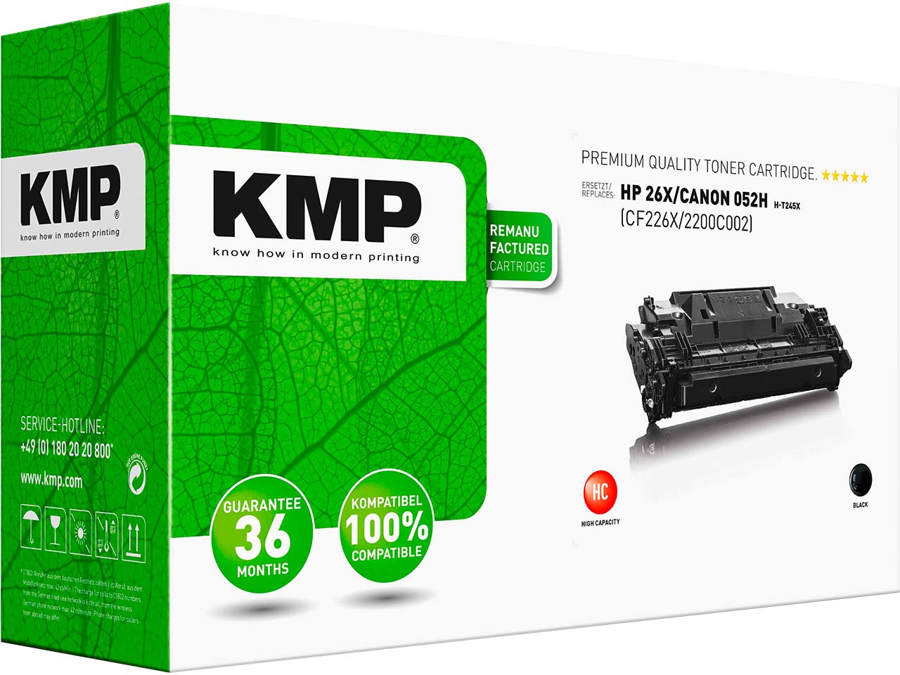 Der KMP Toner bietet eine zuverlässige und kosteneffiziente Alternative zur HP Tonerkartusche Nr. 26X. Er erzielt auf verschiedenen Druckermodellen von Canon und HP exzellente Ergebnisse. Bei einer Schwärzung von 5 % können auf Druckern von HP bis zu 9.000 und auf Modellen von Canon rund 12.000 Seiten gedruckt werden. Farbe schwarz.