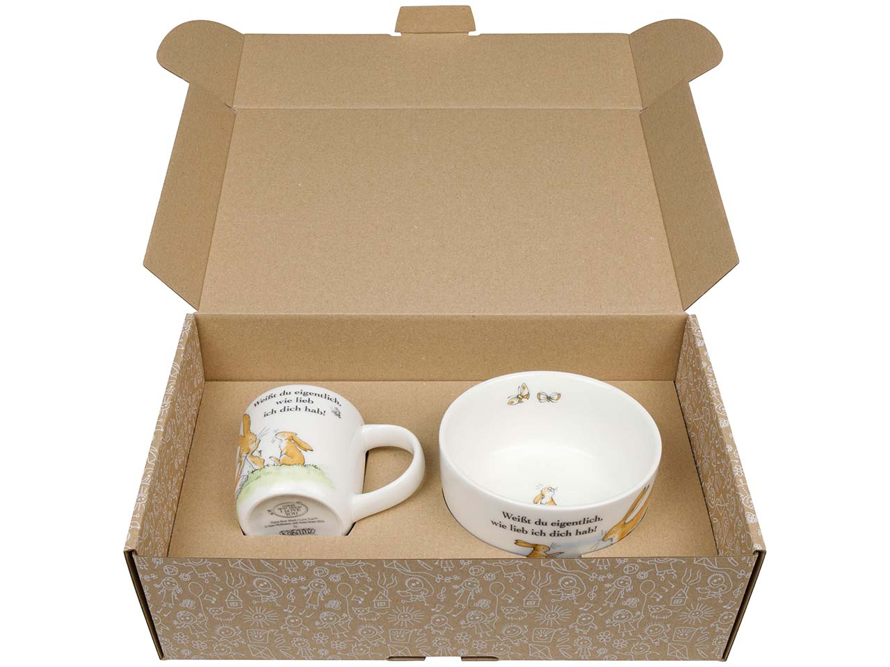 Der Bilderbuchklassiker „Weißt du eigentlich, wie lieb ich dich hab“, der nicht nur als Gute-Nacht-Geschichte beliebt ist, schickt sich an, jetzt auch die Küche für sich einzunehmen. Das 3-teilige Set mit Becher, Schale und Teller aus hochwertigem Bone China begeistert große und kleine Fans. Das Geschirr ist mit Bildern aus dem Buch verziert. Ein Geschenkset, das ganz klar zeigt, wie lieb man jemanden hat!