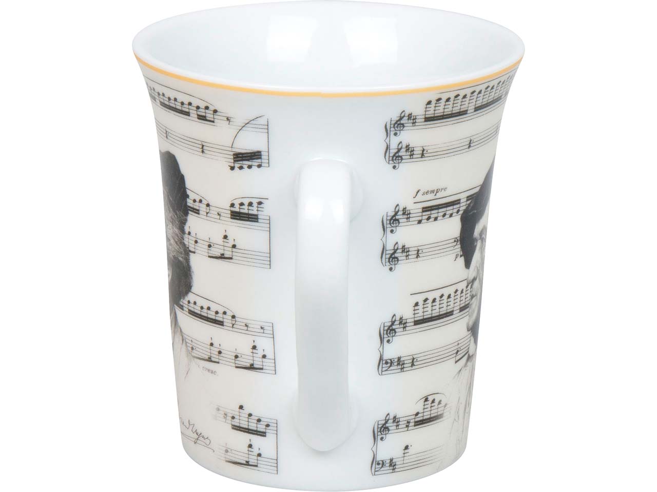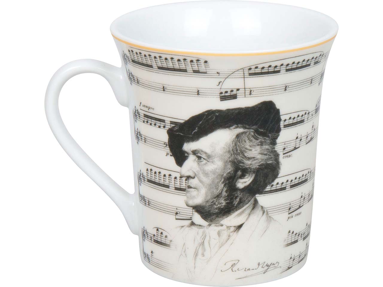 Richard Wagner gehört zu den größten Komponisten der Romantik. Daran erinnert diese in Deutschland hergestellte Tasse aus Porzellan. Das Porträt von Wagner wird von einer Notenpartitur eingerahmt. Das Geschenk für Klassikfans hat einen hübschen Goldrand, der für eine besonders edle Optik sorgt. Die Porzellantasse kann in die Spülmaschine und in die Mikrowelle.
