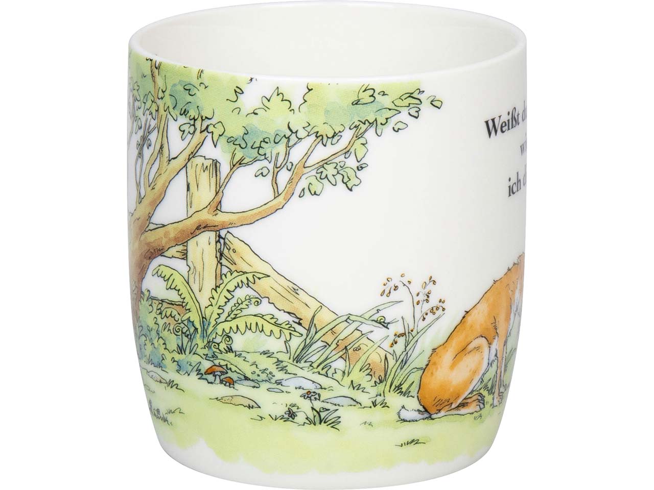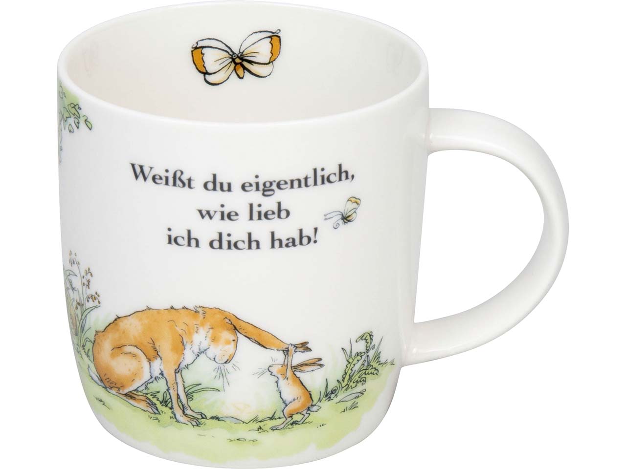 „Weißt du eigentlich, wie lieb ich dich hab“ ist nicht nur der Titel der beliebten Gute-Nacht-Geschichte, sondern auch eine süße Erinnerung daran, den Lieblingsmenschen zu zeigen, wie gern man sie hat. Die Tasse ist aus New Bone China gefertigt, wodurch sie besonders bruchfest ist. Neben der Elfenbeinfarbe zeichnet sich das Material auch dadurch aus, dass es keine Knochenasche enthält. Die niedliche Illustration begeistert Groß und Klein am Frühstückstisch oder beim Nachmittagskaffee. Die Porzellantasse kann in die Spülmaschine und in die Mikrowelle.