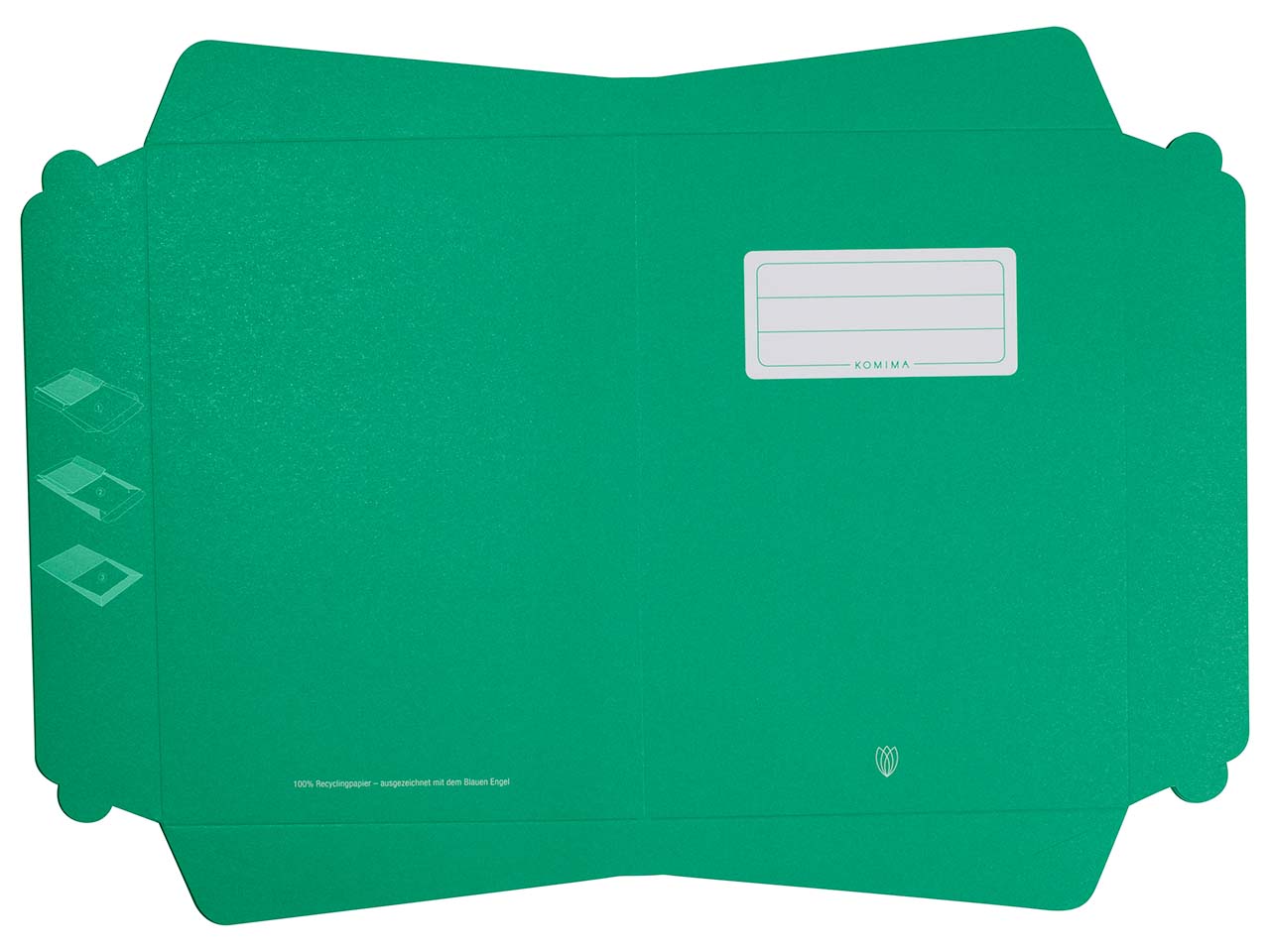 Der Komima Heftumschlag besteht aus mit dem Blauen Engel ausgezeichneten Recyclingpapier, das eine hohe Grammatur von 160 g/m² hat. Der Umschlag schützt Bücher und Hefte im Format DIN A4 vor Verschmutzungen. Die verwendeten Druckfarben basieren auf nachwachsenden Rohstoffen. Design, Druck und Verarbeitung finden in der Nähe von Würzburg statt, wodurch lange Transportwege vermieden werden.