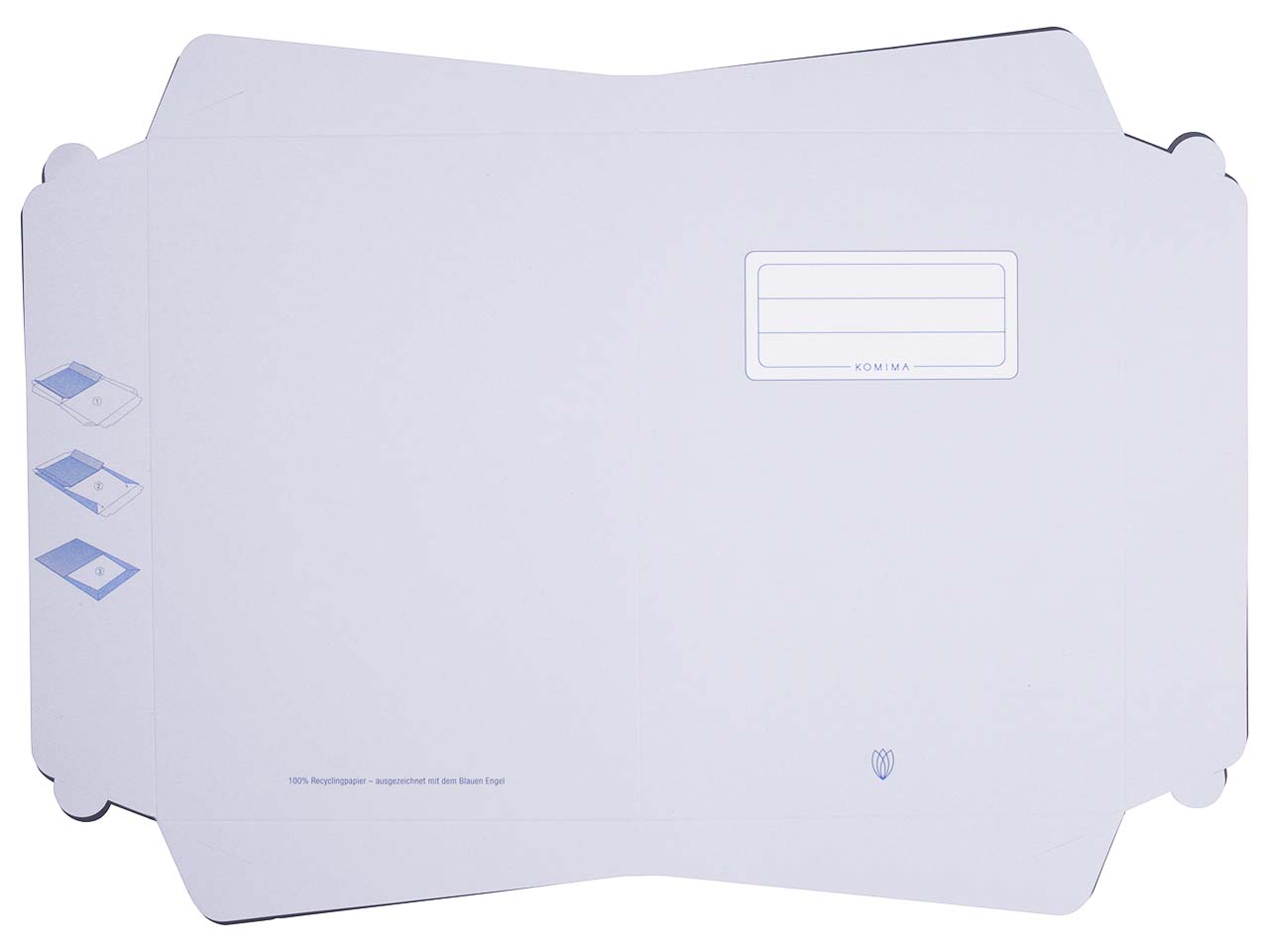 Der Komima Heftumschlag besteht aus mit dem Blauen Engel ausgezeichneten Recyclingpapier, das eine hohe Grammatur von 160 g/m² hat. Der Umschlag schützt Bücher und Hefte im Format DIN A4 vor Verschmutzungen. Die verwendeten Druckfarben basieren auf nachwachsenden Rohstoffen. Design, Druck und Verarbeitung finden in der Nähe von Würzburg statt, wodurch lange Transportwege vermieden werden.