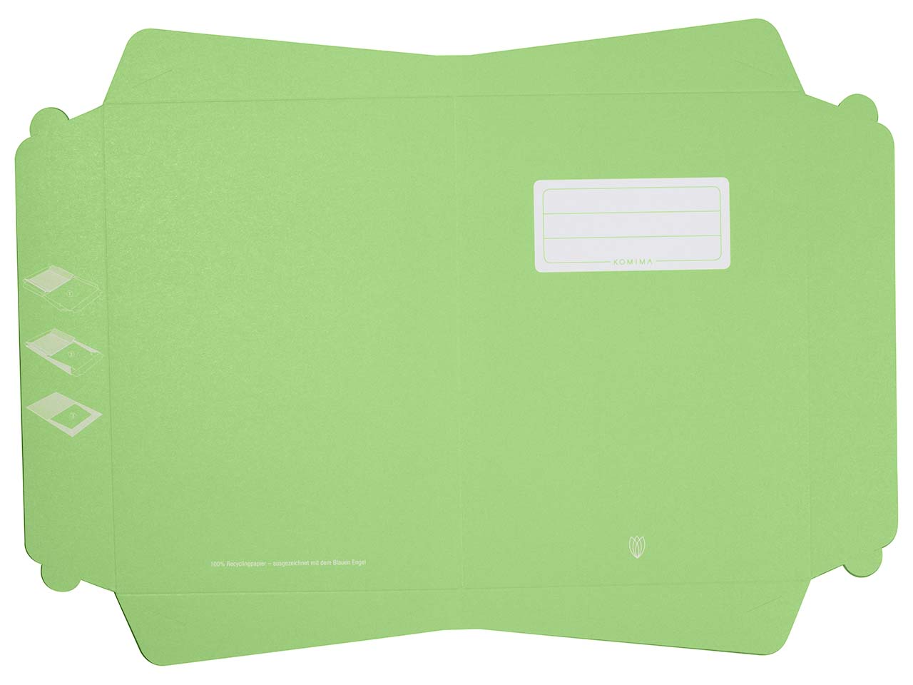 Der Komima Heftumschlag besteht aus mit dem Blauen Engel ausgezeichneten Recyclingpapier, das eine hohe Grammatur von 160 g/m² hat. Der Umschlag schützt Bücher und Hefte im Format DIN A4 vor Verschmutzungen. Die verwendeten Druckfarben basieren auf nachwachsenden Rohstoffen. Design, Druck und Verarbeitung finden in der Nähe von Würzburg statt, wodurch lange Transportwege vermieden werden.