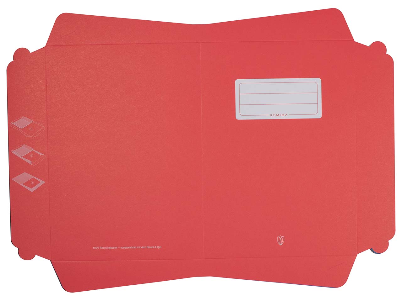 Der Komima Heftumschlag besteht aus mit dem Blauen Engel ausgezeichneten Recyclingpapier, das eine hohe Grammatur von 160 g/m² hat. Der Umschlag schützt Bücher und Hefte im Format DIN A5 vor Verschmutzungen. Die verwendeten Druckfarben basieren auf nachwachsenden Rohstoffen. Design, Druck und Verarbeitung finden in der Nähe von Würzburg statt, wodurch lange Transportwege vermieden werden.