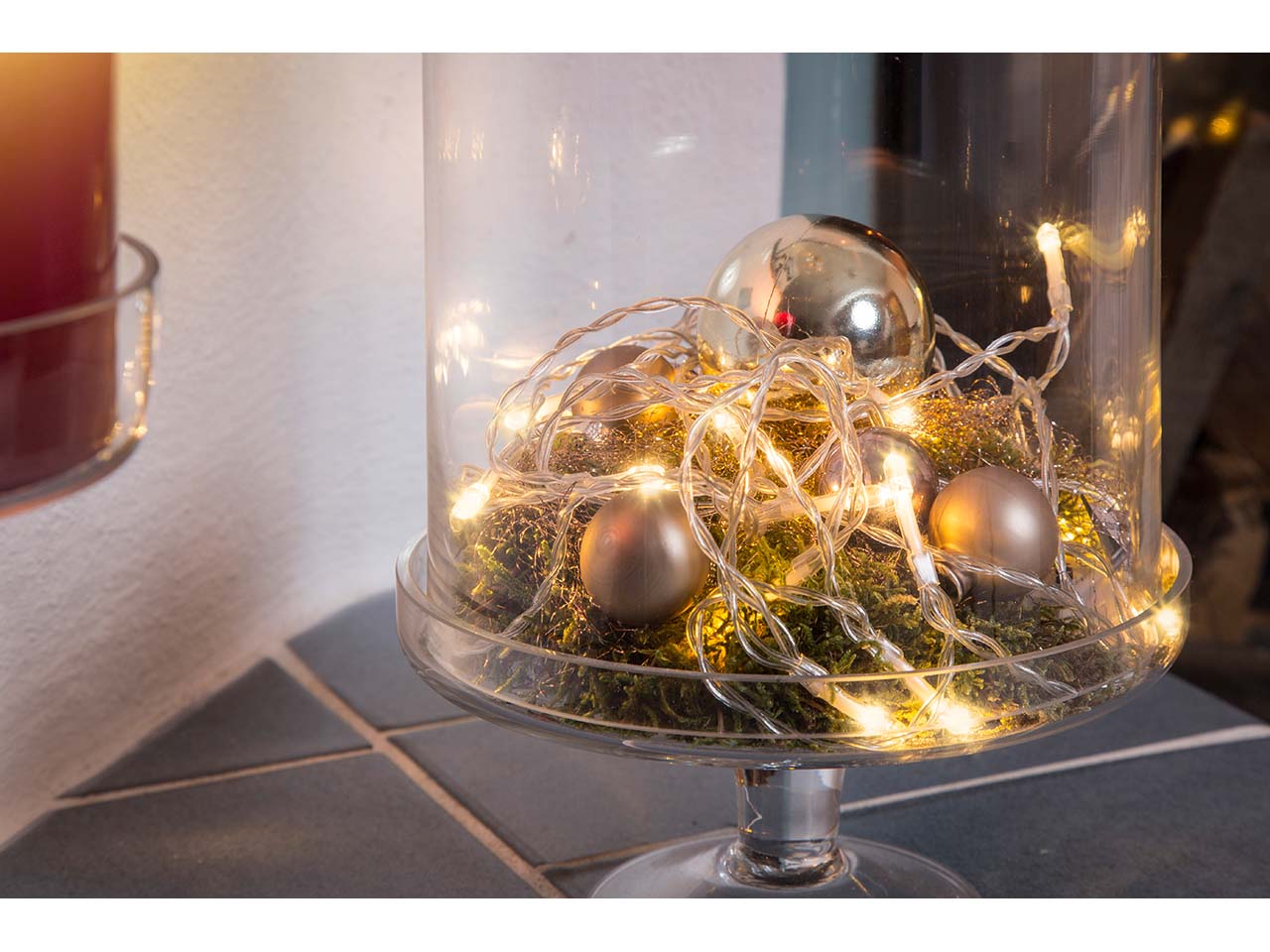 Dekorationen zum Funkeln bringen: Die batteriebetriebene LED-Lichterkette mit warmweißem Licht setzt Akzente im Innenbereich! Sie kann auf die Fensterbank, an den Spiegel oder einem festlich gedeckten Tisch das gewisse Etwas verleihen. Die Möglichkeiten mit der Lichterkette sind unendlich. Dank Batteriebetrieb muss keine Steckdose in der Nähe sein! Über den Schalter ist die Lichterkette schnell ein- oder ausgeschaltet. Der Timer ermöglicht eine flexible Anwendung.