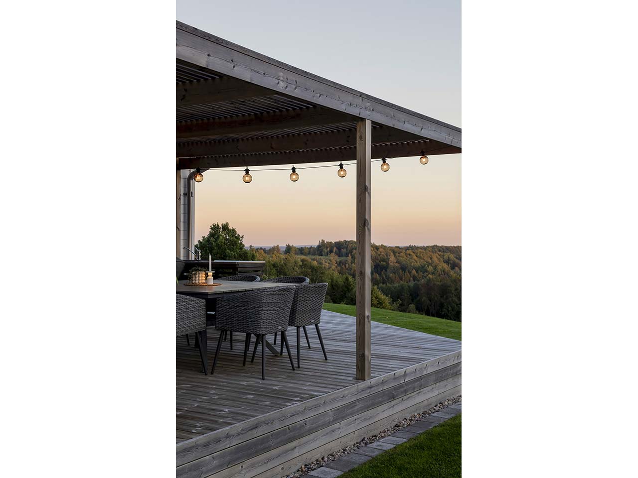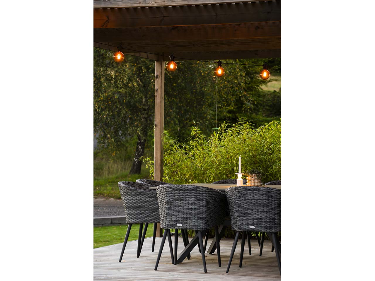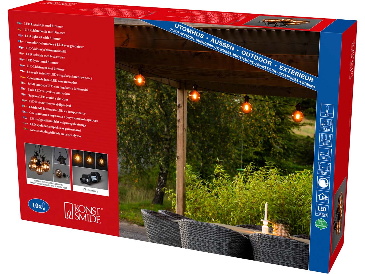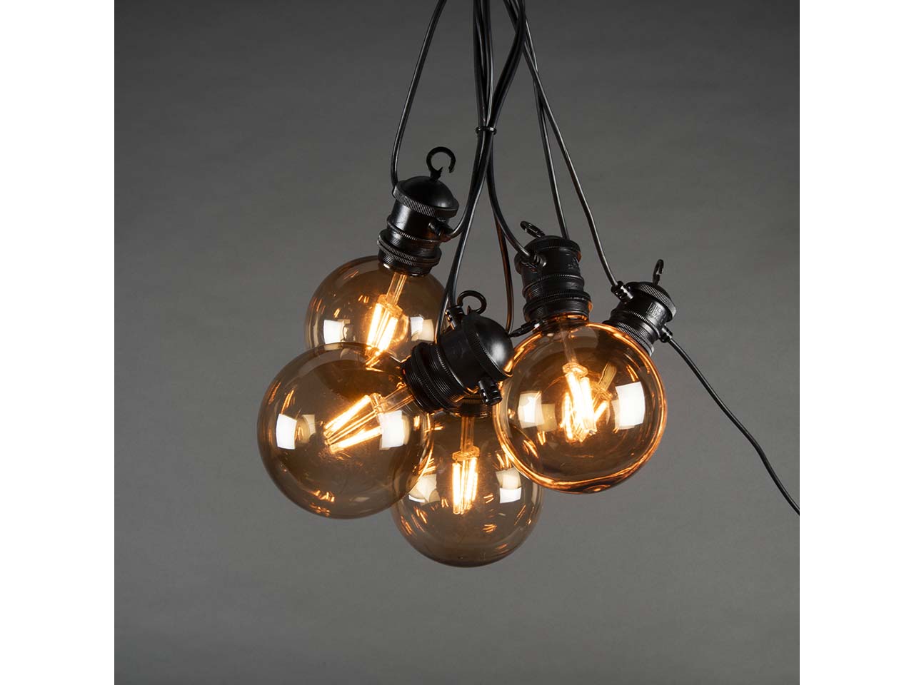 Eine ganz besondere Atmosphäre schafft diese wunderschöne Lichterkette mit 10 großen Birnen. Durch die rauchige Glasfarbe entsteht ein bernsteinfarbenes Licht. Dieses lässt sich ganz nach Bedarf sogar dimmen. Perfekt für Sommerfeste, als Abendbeleuchtung auf der Terrasse oder im Garten und auch für Candlelight-Dinner. Das Beste: Die LEDs lassen sich auch austauschen. So hat man lange Freude an der Lichtquelle.