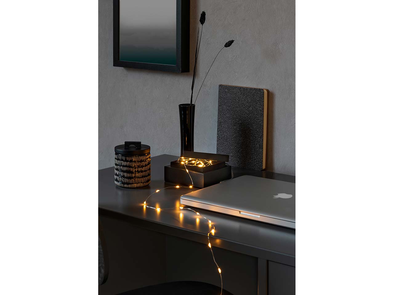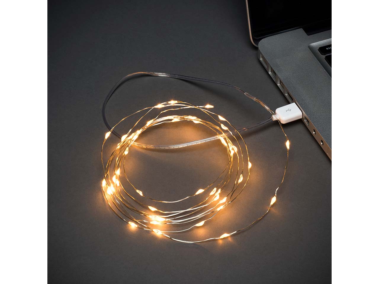 Einfach an einen USB-Port anschließen und schon wird es hell! Die Micro-Lichterkette sorgt mit ihren 50 bernsteinfarbenen LEDs für einzigartiges, stimmungsvolles Licht. Dabei kann sie dank des USB-Anschlusses ganz flexibel eingesetzt werden. Sie lässt sich am Laptop betreiben oder setzt Dekoration in Szene. Mit ihrer besonderen Lichtfarbe ist die Lichterkette im Innenbereich vielseitig nutzbar.