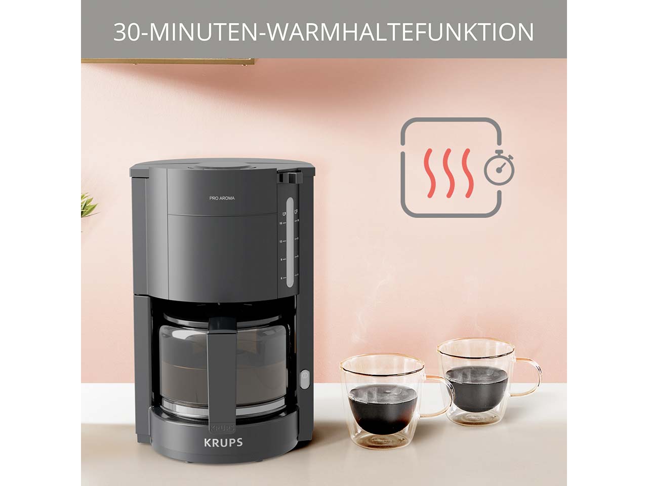 - Mit Warmhaltefunktion und automatischer Abschaltung 30 Minuten nach Brühvorgang
