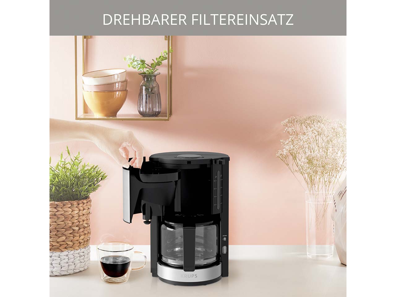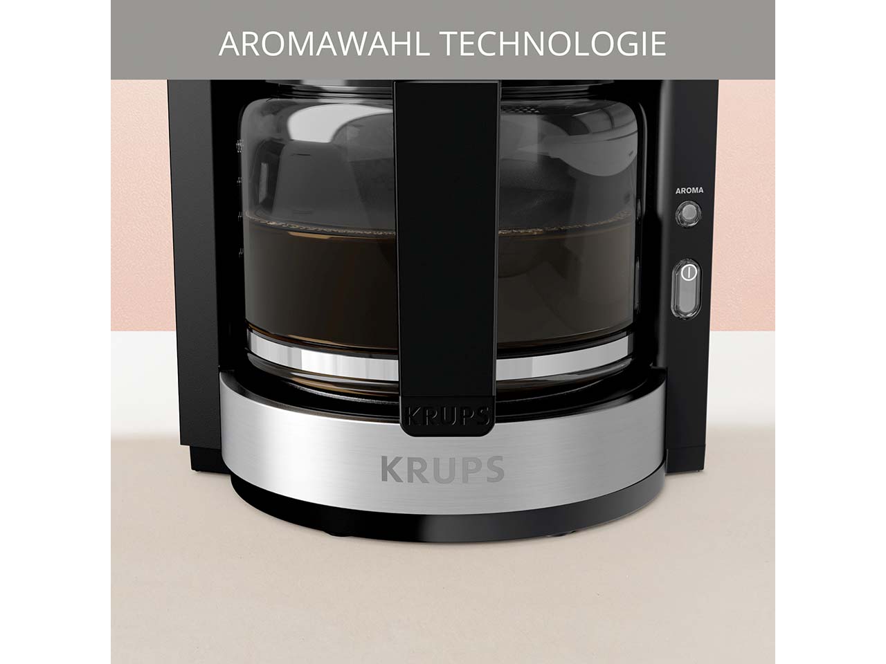 Diese Filterkaffeemaschine von KRUPS bereitet morgens wie mittags frischen Kaffee und liefert so neue Energie für den Tag. Durchdachte Details wie der leicht zugängliche Filtereinsatz und die automatische Öffnung machen die Bedienung besonders komfortabel. Der gut ablesbare Wasserstandsanzeiger sorgt für präzises Befüllen, während die Warmhaltefunktion den Kaffee auf angenehmer Trinktemperatur hält. Nach 30 Minuten schaltet sich das Gerät zur Sicherheit automatisch ab. Dank praktischer Tropfstopp-Funktion ist es möglich, bereits während des Brühvorgangs eine Tasse Kaffee einzuschenken.