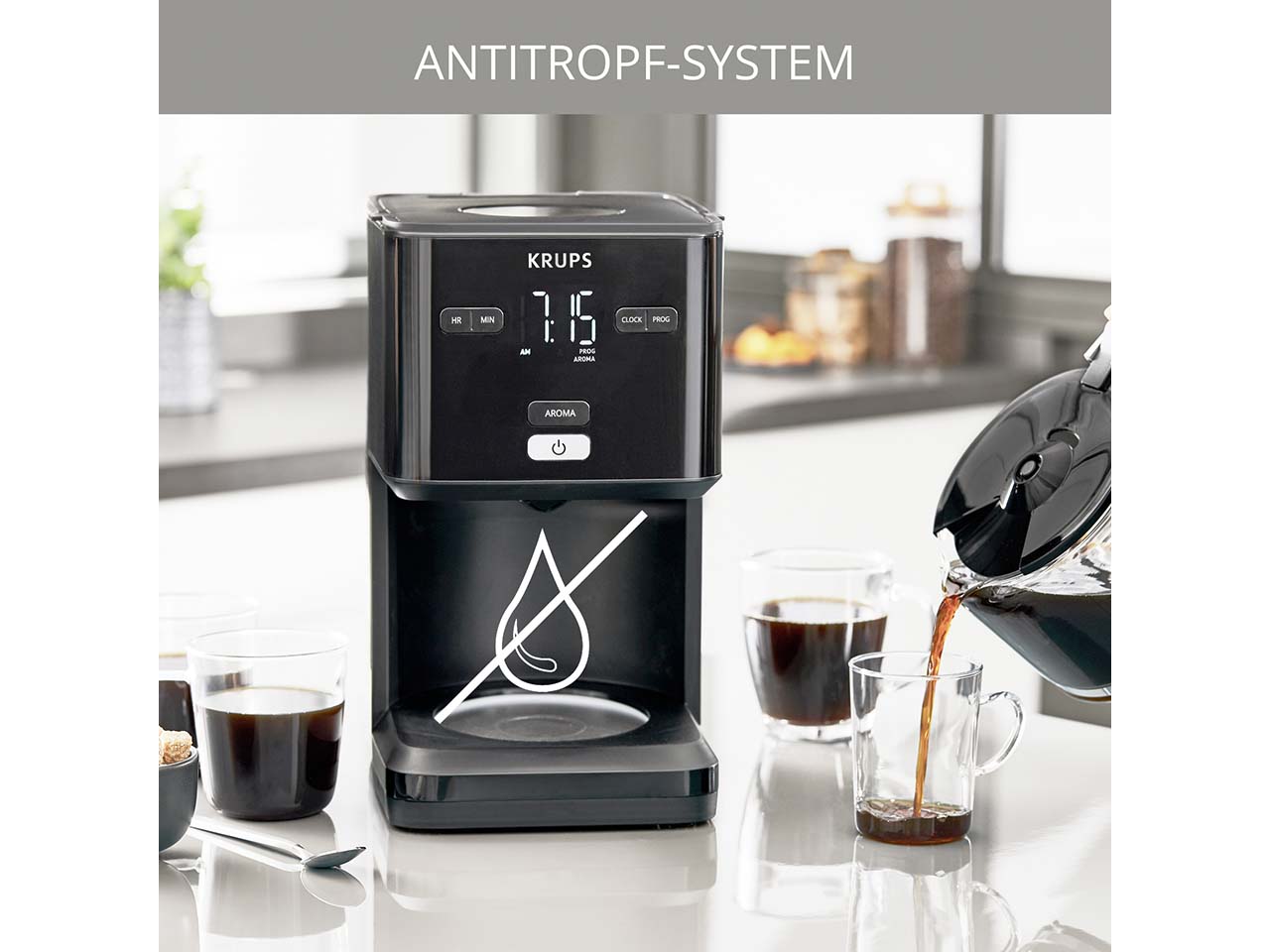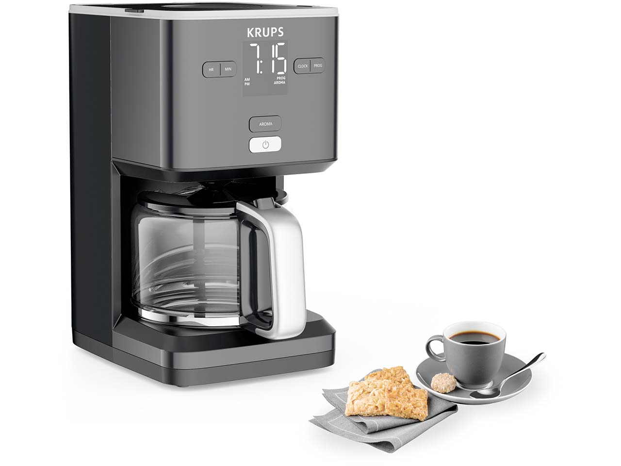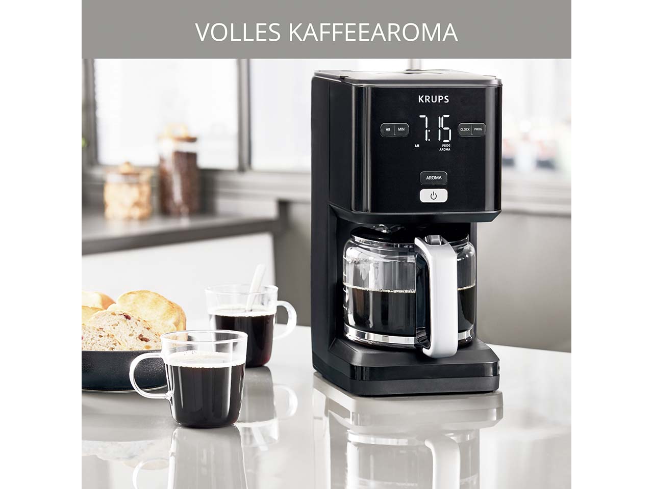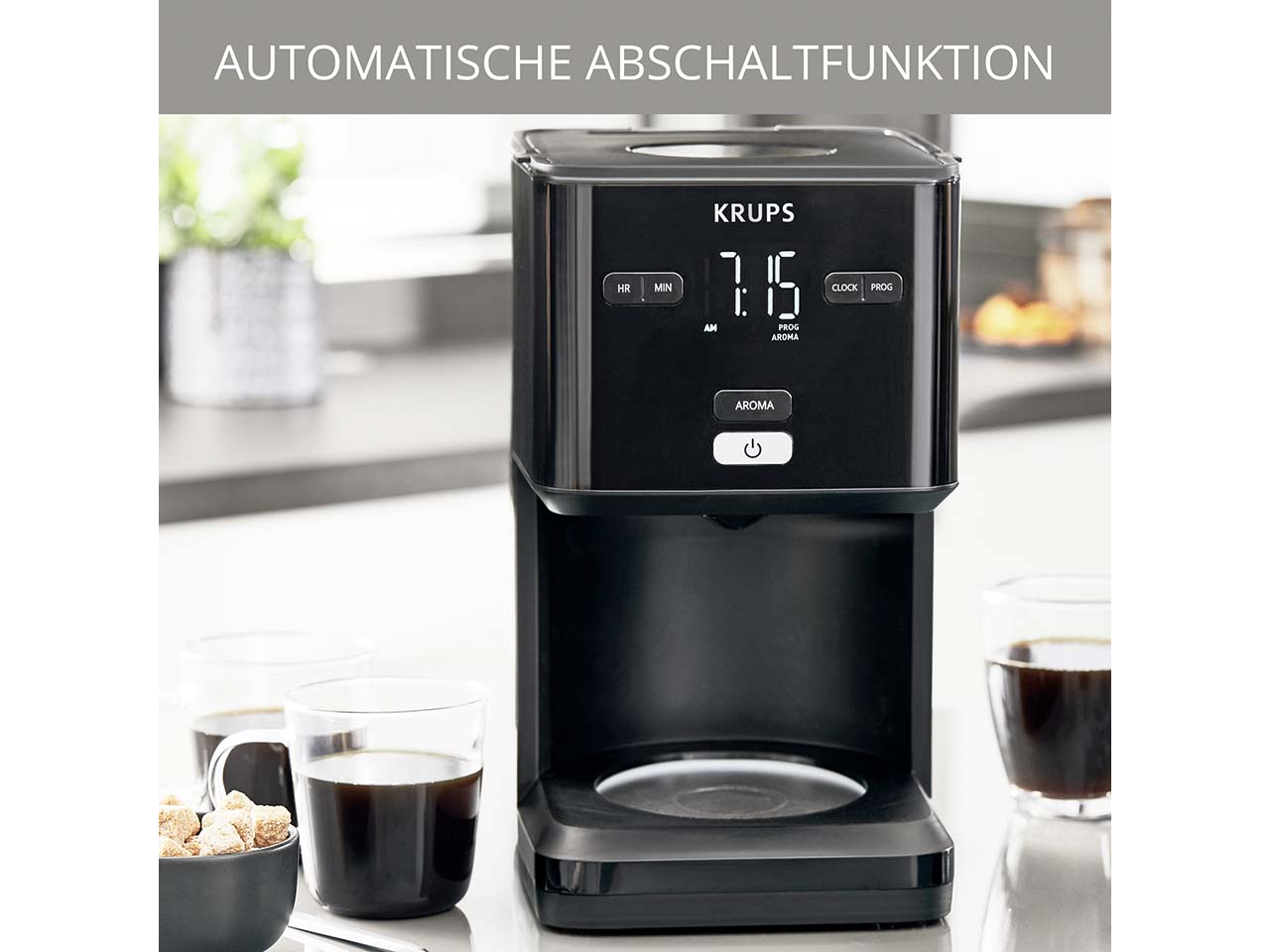 Die Filterkaffeemaschine von KRUPS schafft es, modernen Stil mit cleverer Technik für vollmundigen Kaffeegenuss zu vereinen. Mit einem Fassungsvermögen von 1,25 l brüht sie bis zu 15 Tassen und ist ideal für den Alltag oder auch kleine Büros. Die AROMA-Funktion mit Vorbrühen sorgt für intensiven Geschmack. Der 24-Stunden-Timer sorgt für frisch gebrühten Kaffee zu jedem Zeitpunkt. Tropfstopp, Warmhaltefunktion und automatische Abschaltung nach 30 Minuten bieten Komfort und Sicherheit.