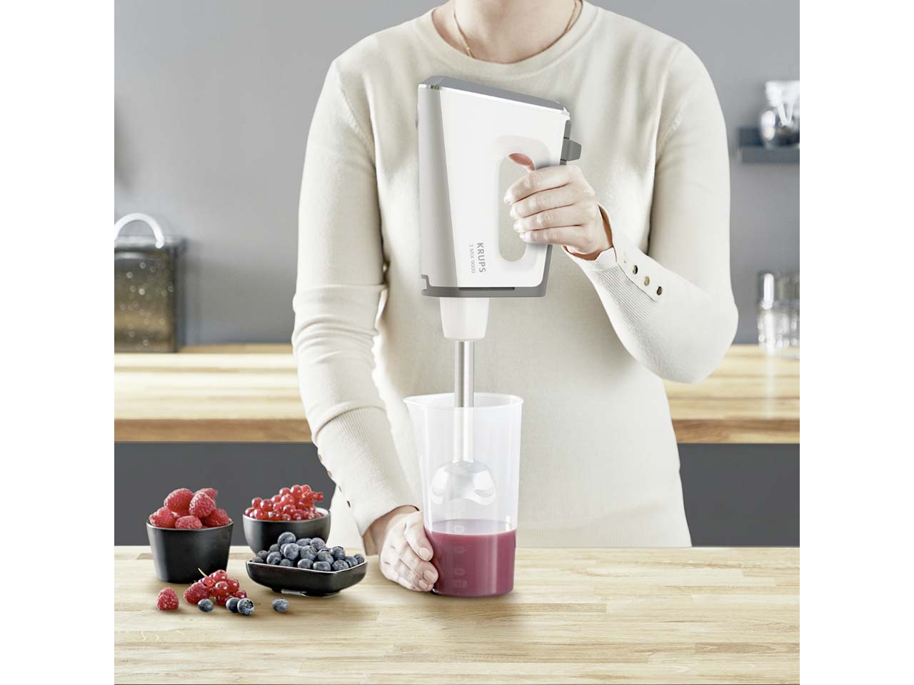 Ob Kuchen, Plätzchen, Sahne oder Eischnee – ohne Handmixer! Das Küchengerät von KRUPS bietet dazu noch einige Extras: Das Handrührgerät wird mit Messbecher und Pürierstab-Aufsatz geliefert. So lassen sich damit auch Pürees leicht zubereiten. Der Handmixer mit 750-W-Leistung mixt selbst hartnäckiges Mixgut wie Nüsse. Dabei hilft die Turbotaste. Knethaken und Schneebesen bestehen aus Edelstahl. Dadurch ist das Zubehör strapazierfähig, langlebig und leicht zu reinigen. Der ergonomische Griff hilft beim Rühren.