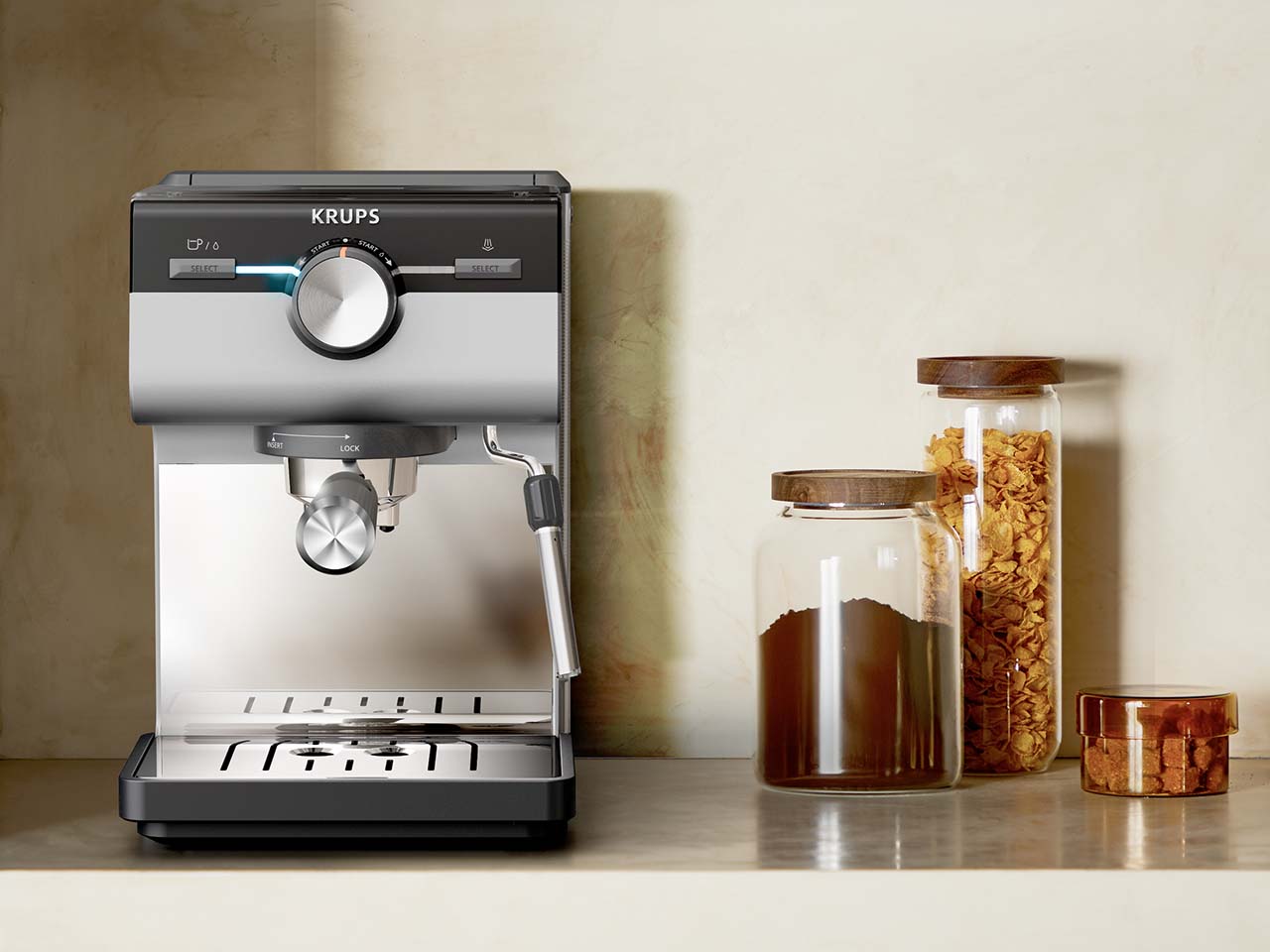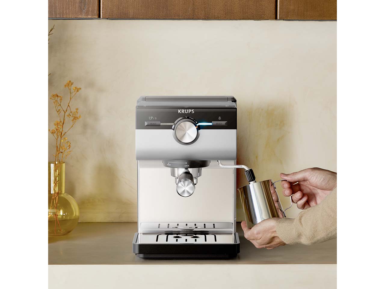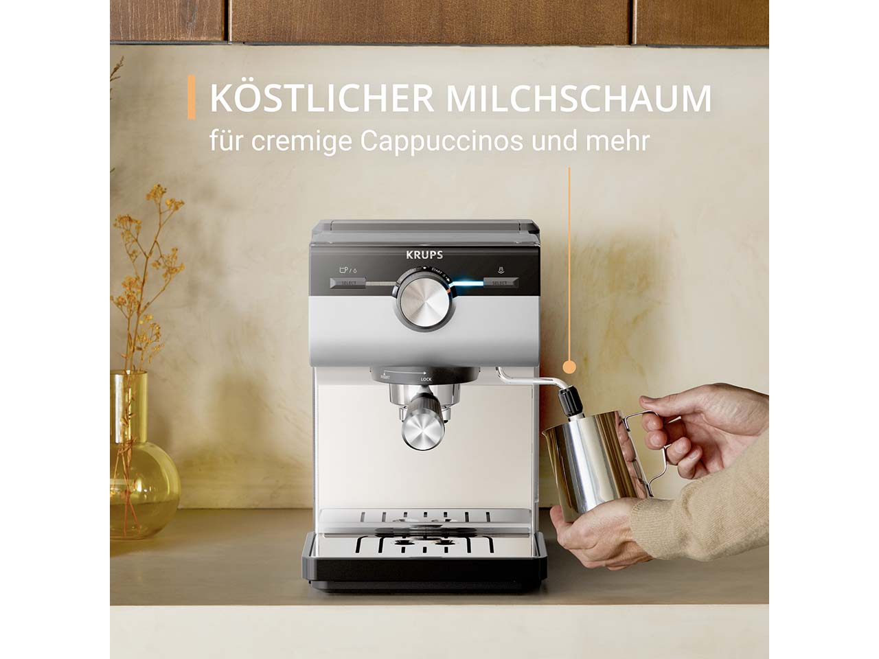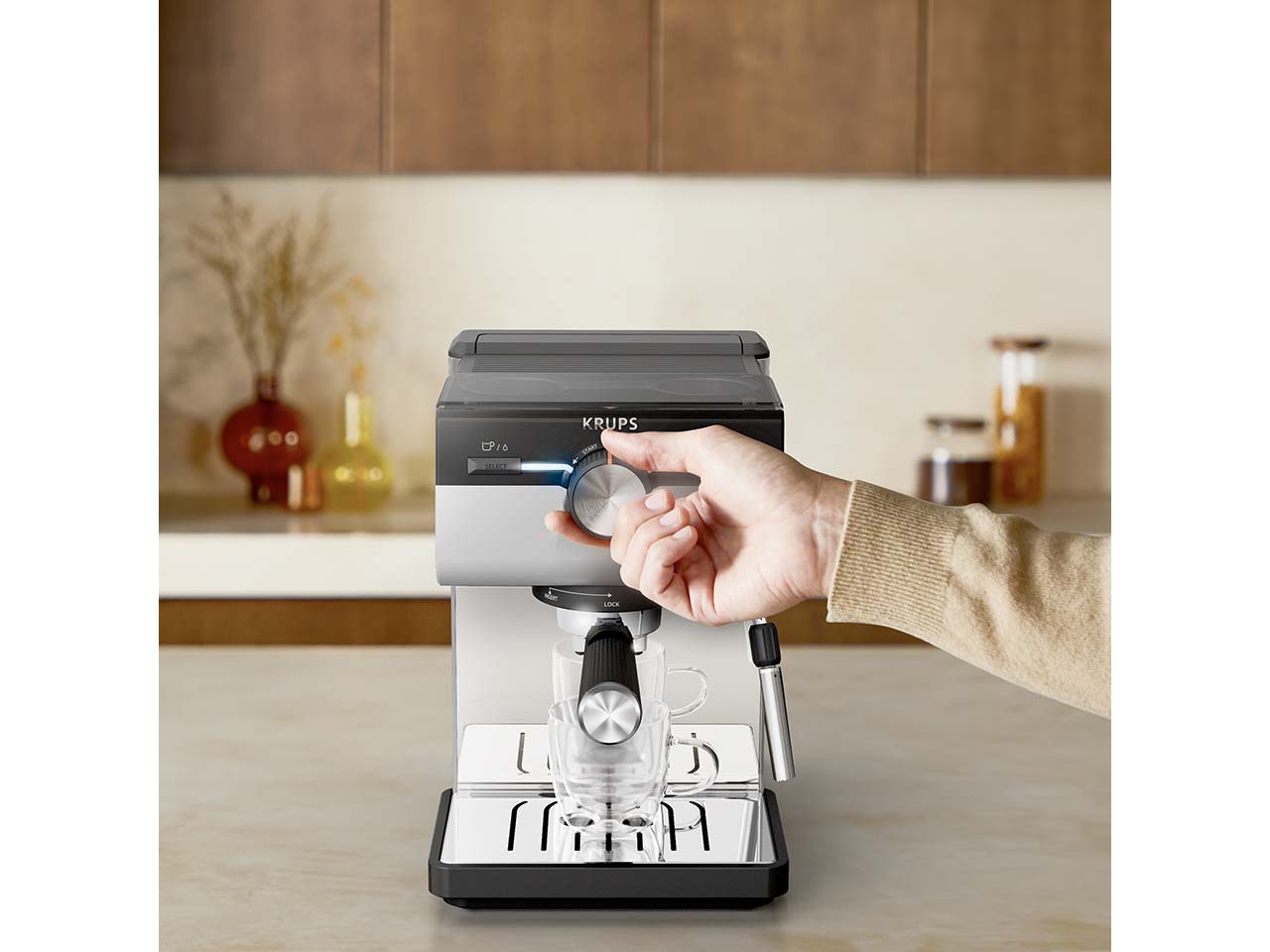 Die Siebträger-Kaffeemaschine von KRUPS vereint authentische Espressozubereitung mit präziser Kontrolle und elegantem Design. Mit einem Pumpendruck von 15 bar und konstanter Wassertemperatur sorgt sie für intensive Aromen und eine perfekte Crema. Die Edelstahl-Dampfdüse ermöglicht feinporigen Milchschaum für Cappuccino oder Latte Macchiato. Tee und Americano lassen sich mit der Heißwasserfunktion perfekt zubereiten. Der abnehmbare 2-Liter-Wassertank mit sichtbarem Wasserstand bietet hohen Bedienkomfort und reduziert Nachfüllintervalle. Dank intuitiver manueller Steuerung lässt sich zwischen einer oder zwei Tassen sowie Milchschaum wählen. Große Gummifüße sorgen für Stabilität.