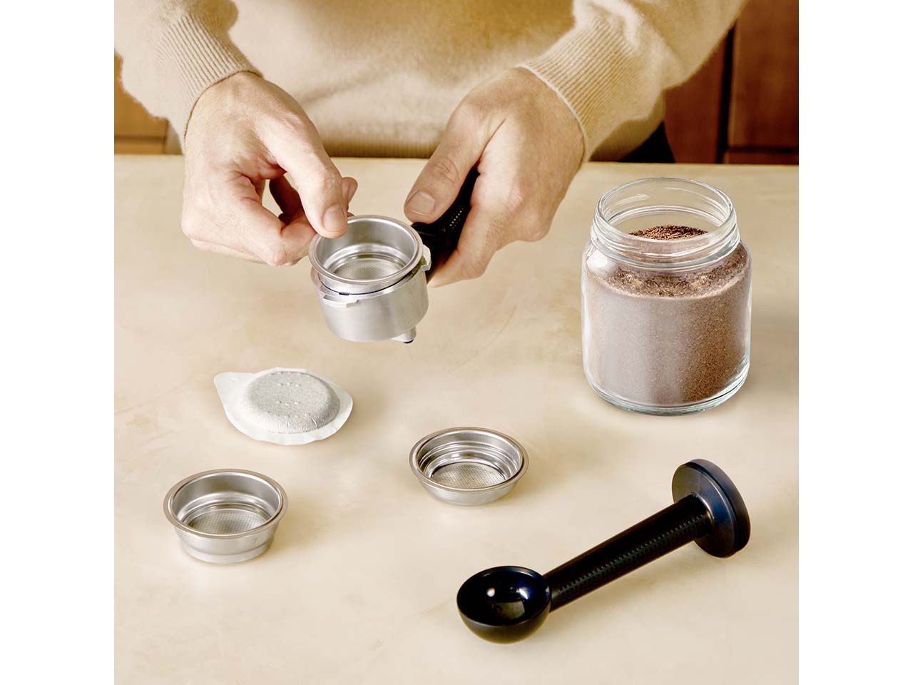 - 3 Filtereinsätze für die Wahl zwischen frischem, vorgemahlenem oder ESE-Pod-Kaffee
