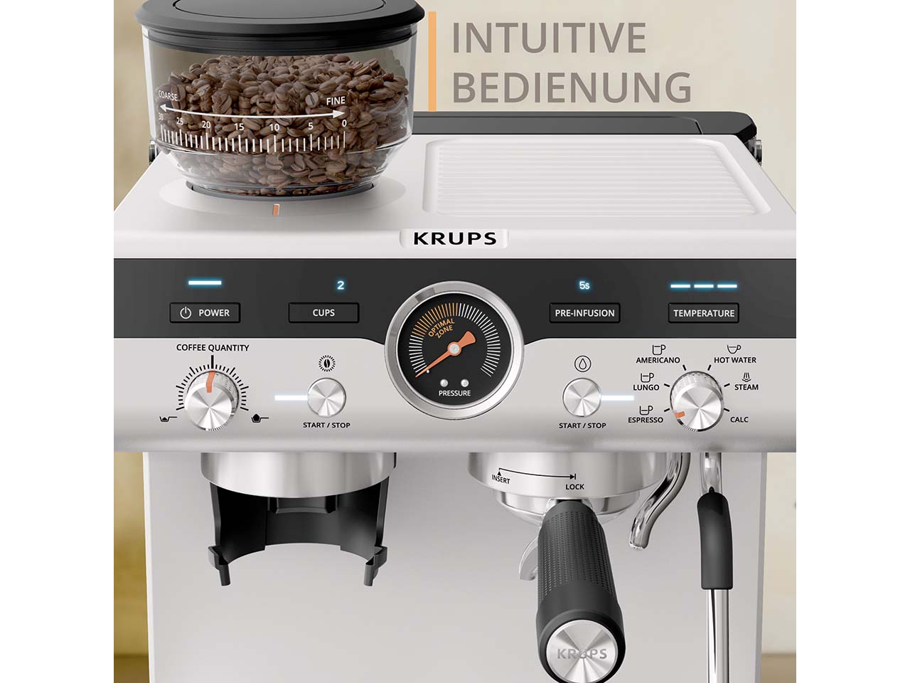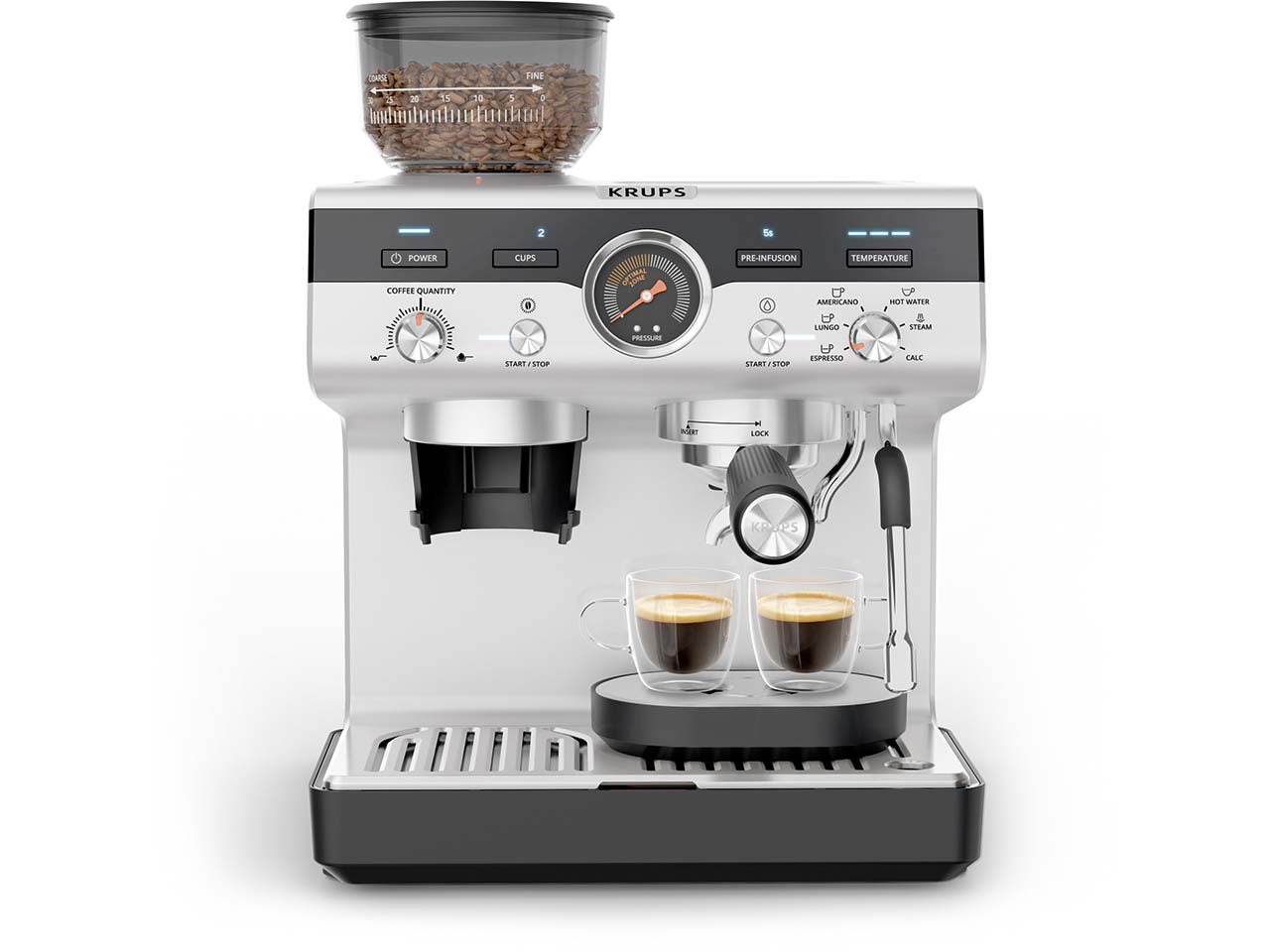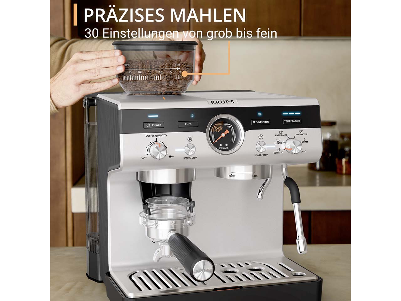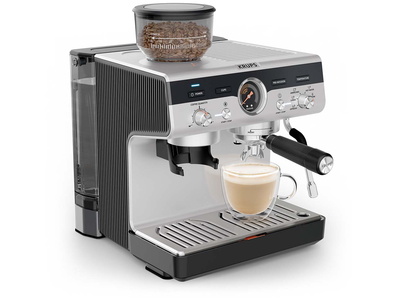 Die Siebträger-Espressomaschine von KRUPS ist ein kleines Meisterwerk, das den Espressogenuss in die eigenen vier Wände bringt. Das integrierte Kegelmahlwerk mit 30 Mahlgradeinstellungen ermöglicht die individuelle Anpassung an jede Bohnensorte. Über das intuitive Kontrolllayout lassen sich Mahlgrad, Temperatur und Pre-Infusion einfach steuern, um jedes Mal perfekte Ergebnisse zu erzielen. Drei Pre-Infusion-Einstellungen intensivieren das Aroma und drei Temperatureinstellungen garantieren die optimale Extraktion. Das Thermoblock-System sorgt für schnelles Aufheizen und ermöglicht die Zubereitung von Espresso, Lungo, Americano oder heißem Wasser in weniger als einer Minute. Die professionelle Dampfdüse erzeugt feinporigen Milchschaum für Cappuccino, Latte Macchiato oder kunstvolle Latte-Art. In der Lieferung enthalten ist eine Tamper Station mit Abschlagbehälter aus Edelstahl, eine Edelstahl-Milchkanne, ein Barista-Reinigungstuch, verschiedene Filtereinsätze für eine oder zwei Tassen sowie praktisches Zubehör für Pflege und Komfort. Die zweite Abtropfschale dient als Tassenerhöhung für kleinere Espressotassen.