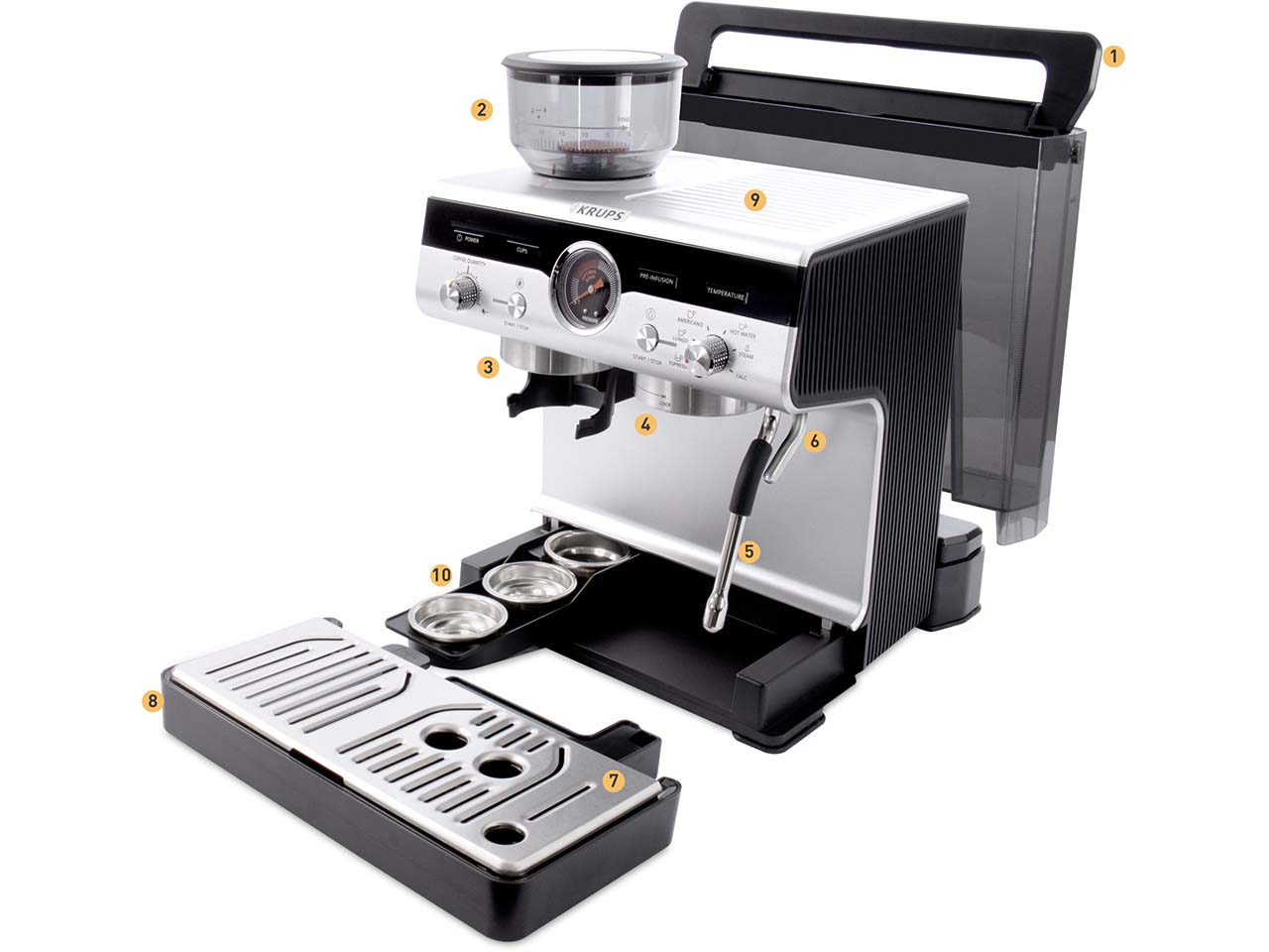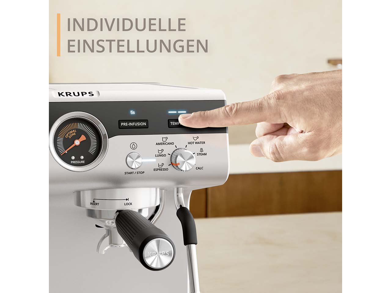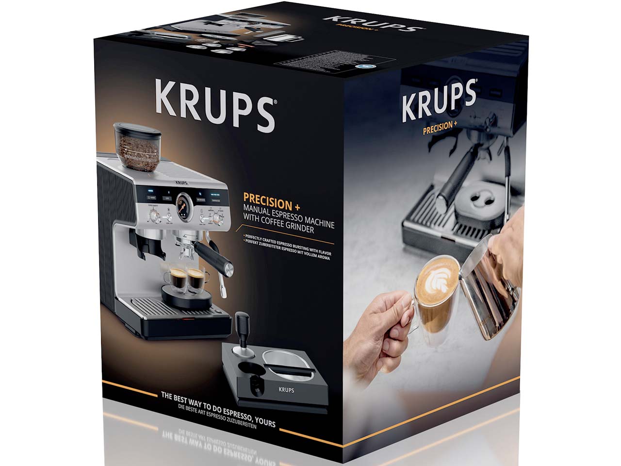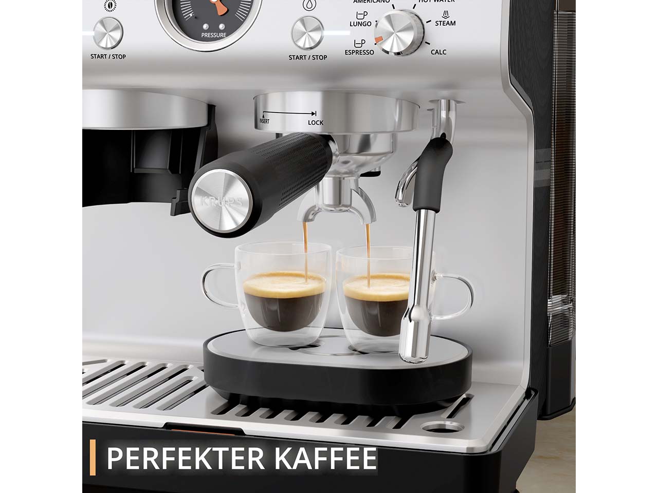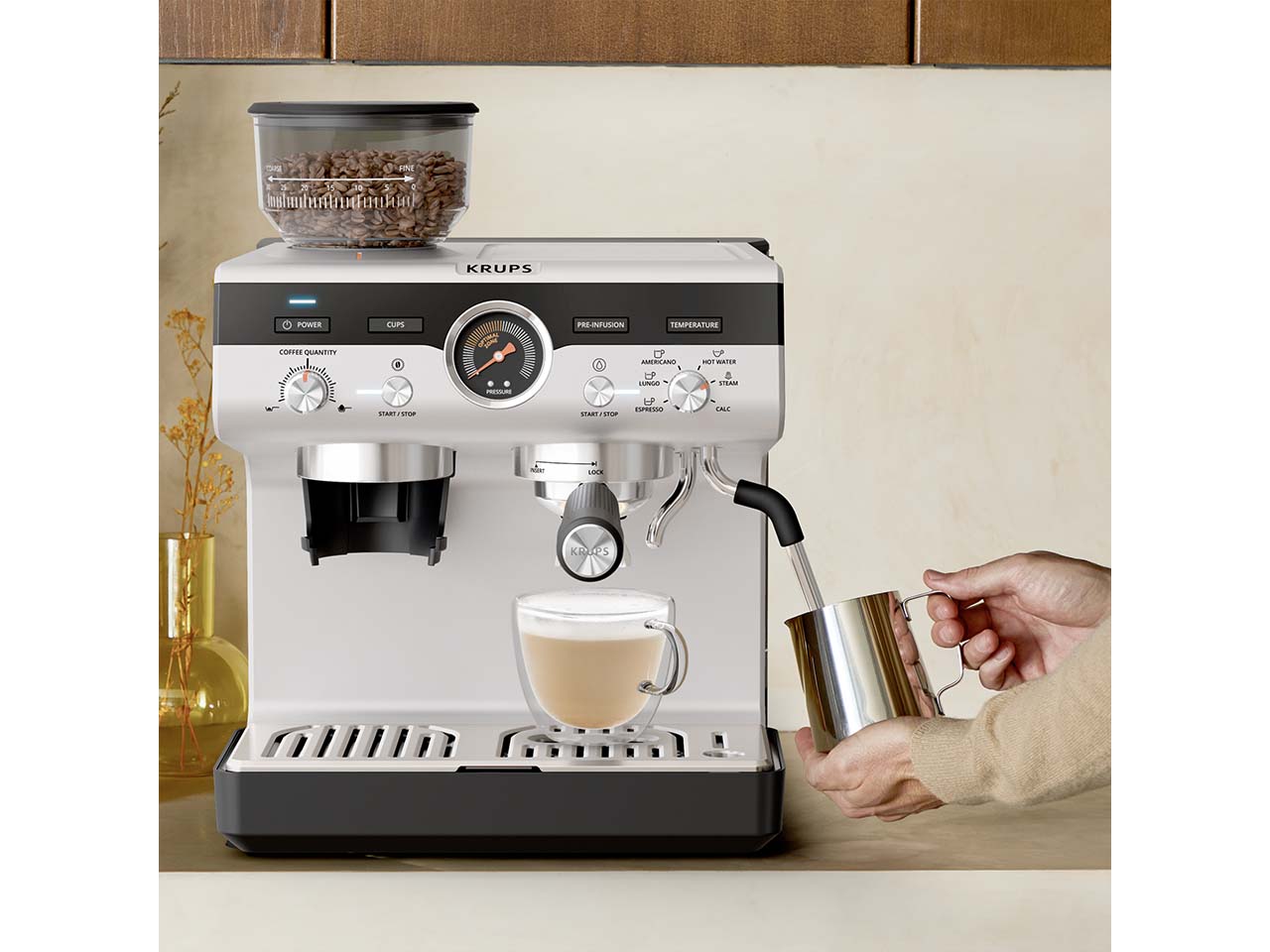Die Siebträger-Espressomaschine von KRUPS ist ein kleines Meisterwerk, das den Espressogenuss in die eigenen vier Wände bringt. Das integrierte Kegelmahlwerk mit 30 Mahlgradeinstellungen ermöglicht die individuelle Anpassung an jede Bohnensorte. Über das intuitive Kontrolllayout lassen sich Mahlgrad, Temperatur und Pre-Infusion einfach steuern, um jedes Mal perfekte Ergebnisse zu erzielen. Drei Pre-Infusion-Einstellungen intensivieren das Aroma und drei Temperatureinstellungen garantieren die optimale Extraktion. Das Thermoblock-System sorgt für schnelles Aufheizen und ermöglicht die Zubereitung von Espresso, Lungo, Americano oder heißem Wasser in weniger als einer Minute. Die professionelle Dampfdüse erzeugt feinporigen Milchschaum für Cappuccino, Latte Macchiato oder kunstvolle Latte-Art. In der Lieferung enthalten ist eine Tamper Station mit Abschlagbehälter aus Edelstahl, eine Edelstahl-Milchkanne, ein Barista-Reinigungstuch, verschiedene Filtereinsätze für eine oder zwei Tassen sowie praktisches Zubehör für Pflege und Komfort. Die zweite Abtropfschale dient als Tassenerhöhung für kleinere Espressotassen.