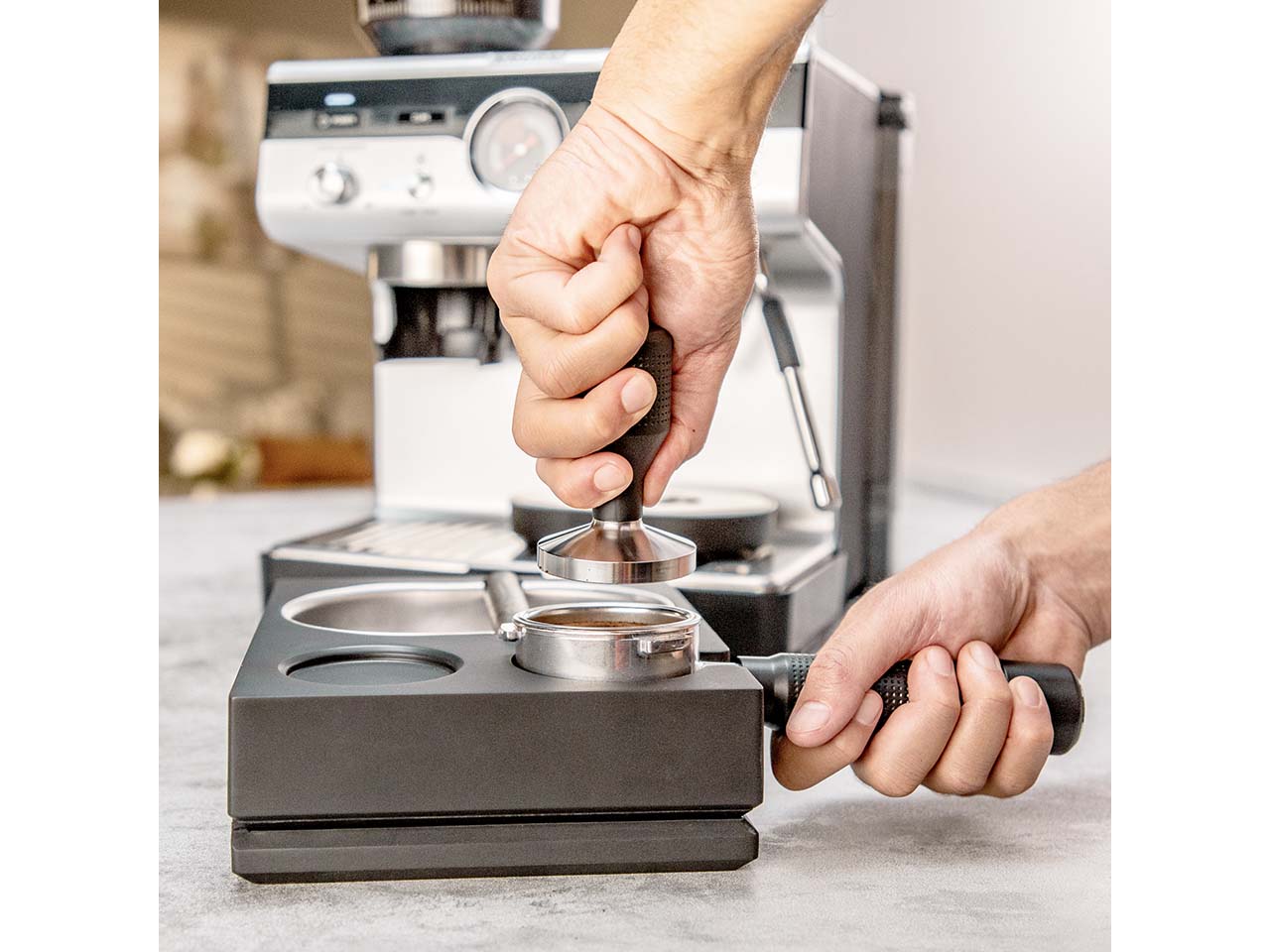 Siebträgermaschine mit Mahlwerk und Tamping Station