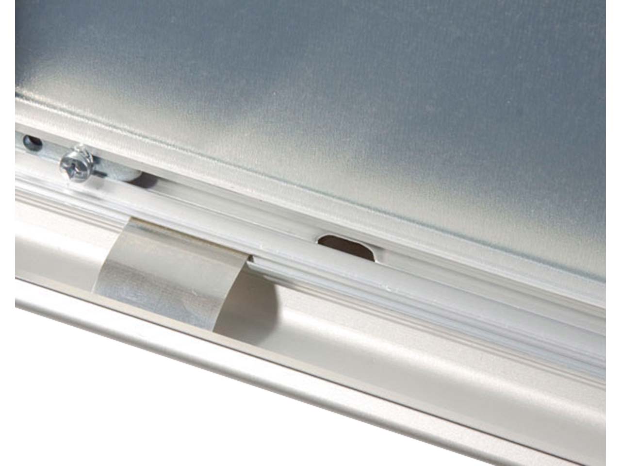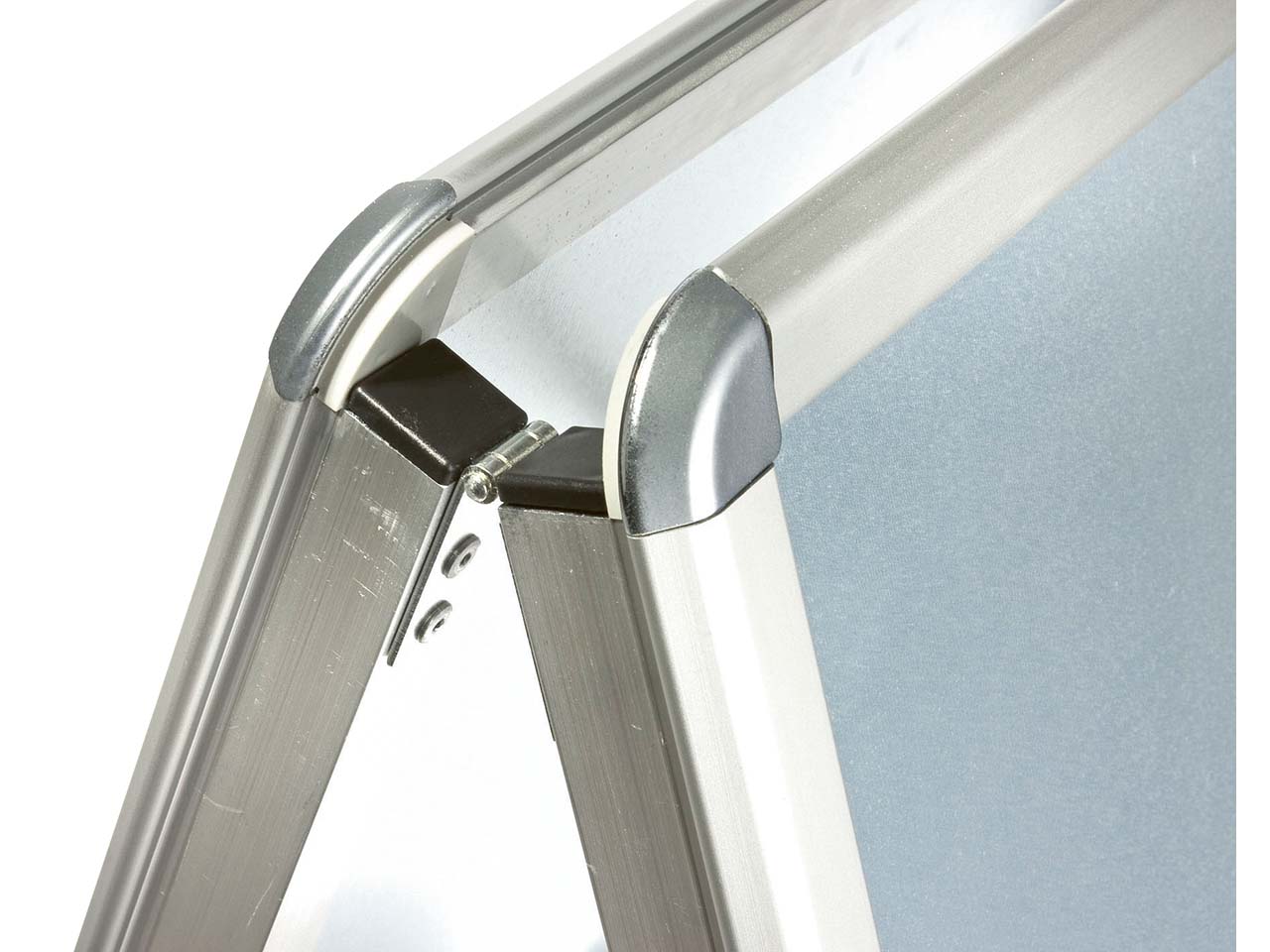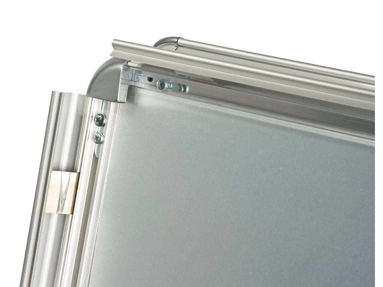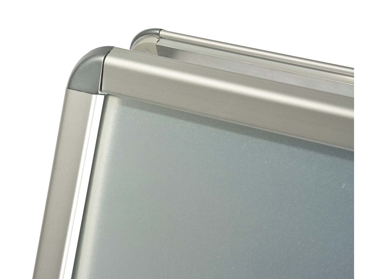 Der Plakatwechsel ist durch frontseitiges Aufklappen der Rahmenprofile besonders einfach möglich. Gestell aus silber eloxiertem Alu-Profil (32 mm), Standfüße aus Alu-Rechteck-Rohren (25 mm), Metallrückwände aus verzinktem Stahlblech. Rondo-Ecken aus ABS-Kunststoff, inkl. zwei Polypropylen-Schutzfolien (0,5 µ).