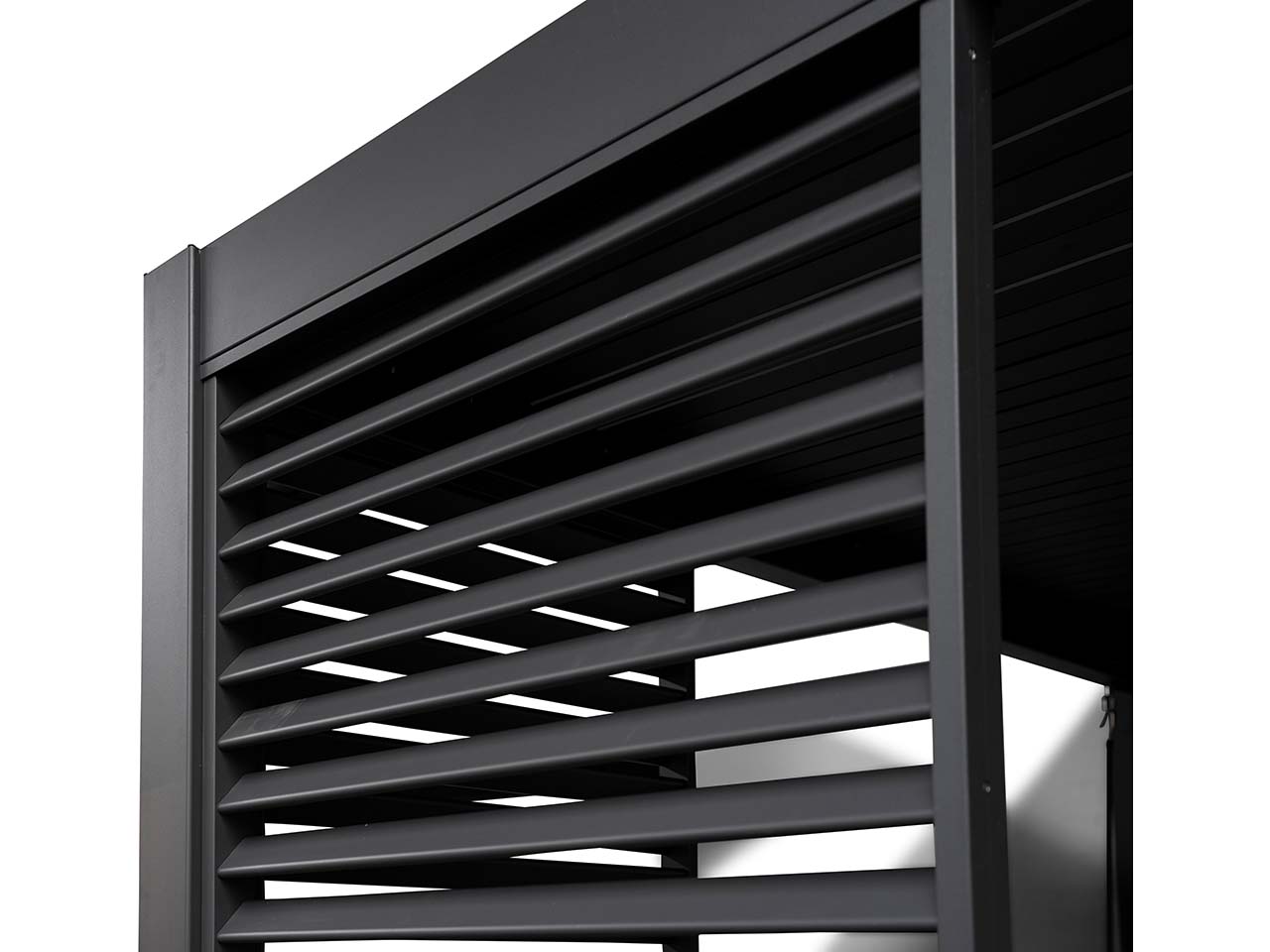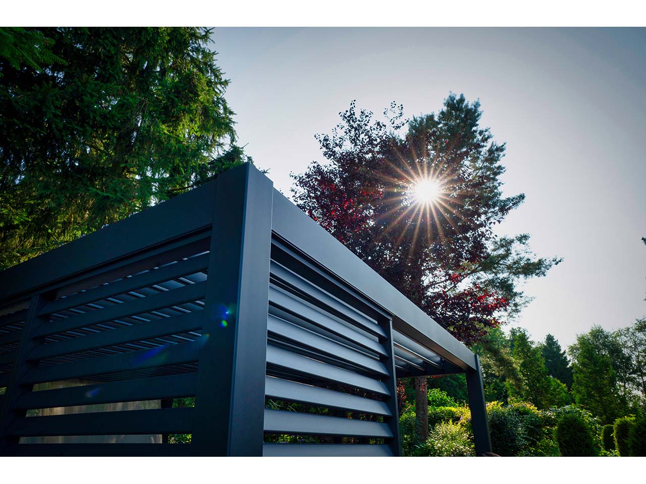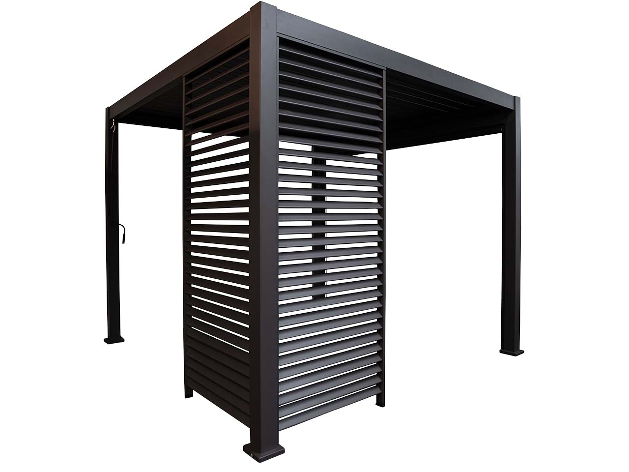 Diese moderne Seitenwand aus stabilem, langlebigem Aluminium ist perfekt, um die Terrassenüberdachung „Cadiz“ weiter zu individualisieren. Die Lamellenwand mit festen Lamellen bietet sich als Sichtschutz und Schattenspender an. Die Montage an der Überdachung gestaltet sich einfach.