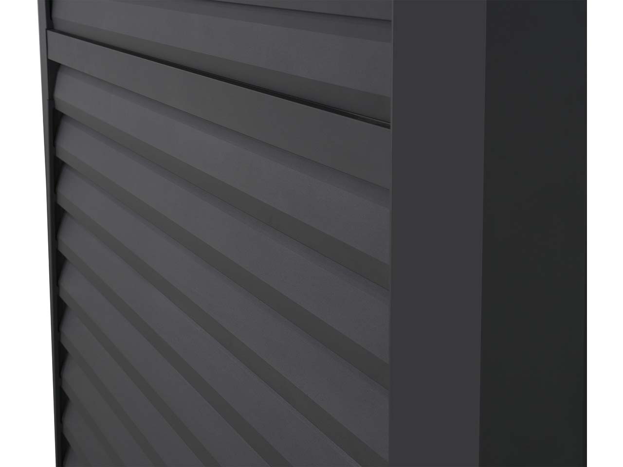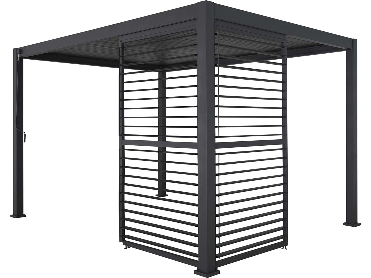 Perfekter Schutz mit Stil: Die Lamellenwand ergänzt die Terrassenüberdachung „Cadiz“. Sie besteht aus stabilem, langlebigem Aluminium und die Lamellen lassen sich so verstellen, dass Lichteinfall und Sichtschutz anpassbar sind. Mit ihrer eleganten Optik ist die Rollladen-Wand zudem ein besonders ansprechendes Zubehör.