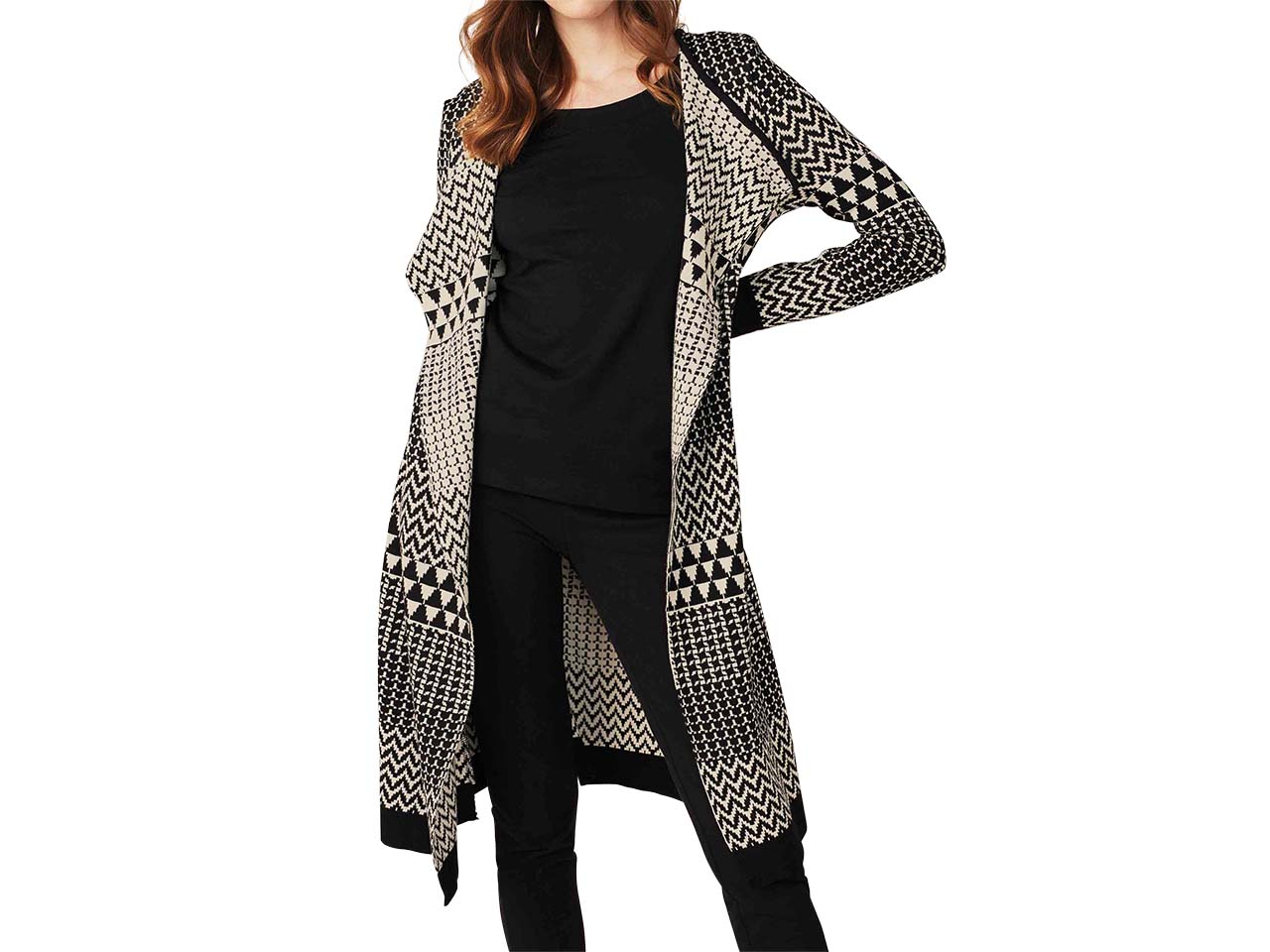 Modisch gegen klirrende Kälte: Dieser wunderschöne Strickmantel wärmt Damen und sieht dazu noch fantastisch aus! Das raffinierte Muster wirkt ausgesprochen modern und zieht alle Blicke auf sich. Durch die Herstellung aus GOTS-zertifizierter Bio-Baumwolle fühlt sich die Jacke angenehm weich auf der Haut an. Da die Strickjacke weder Knöpfe noch einen Reißverschluss hat, kann man sich darin so richtig schön einkuscheln. Die Midi-Länge sorgt für ein Plus an Wärme. Ein Must-have für kühle Tage Zuhause oder im Büro!